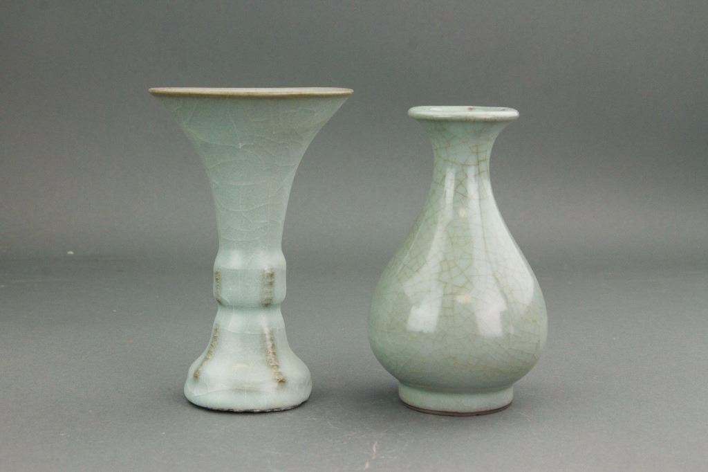 Two pieces of Chinese Geyao style porcelain vase; one of cylinder body with splayed mouth and foot; one of pear shape body with splayed mouth; all covered with crackled celadon glaze; H: 13.5 cm, D: 9 cm, 500 grams