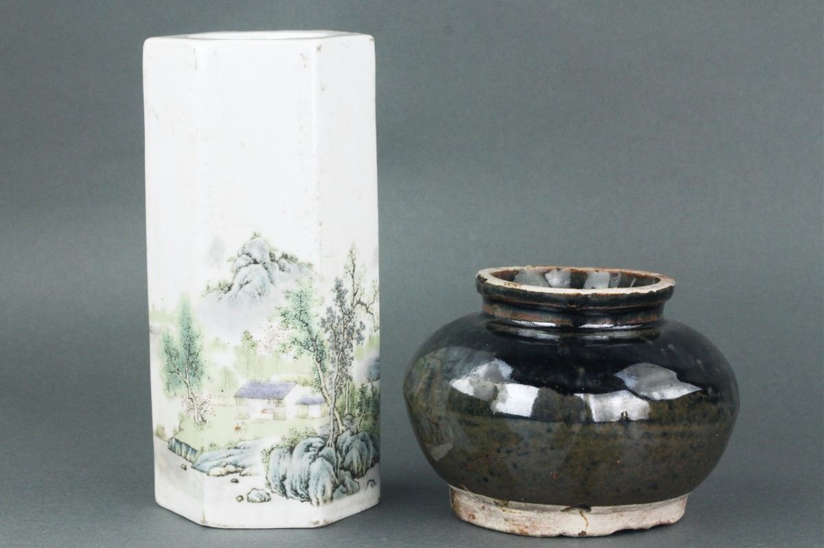 Two pieces of Chinese porcelain items; comprised of a hexagon brushpot and a brown-glazed waterpot; the brushpot with six-character Jiangxi Ciye Gongsi mark on base; H: 18 cm, W: 7.5 cm, D: 13 cm, 905 grams total