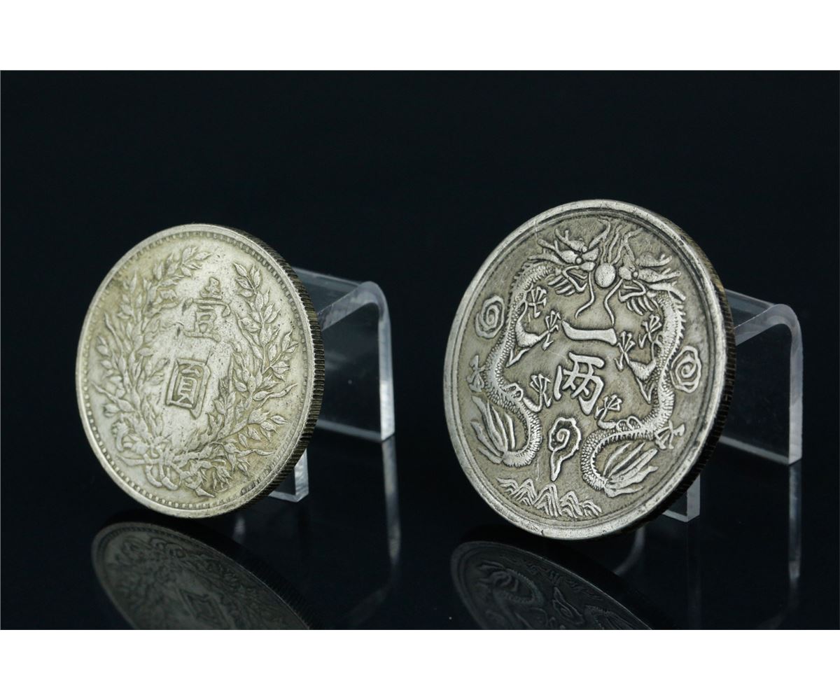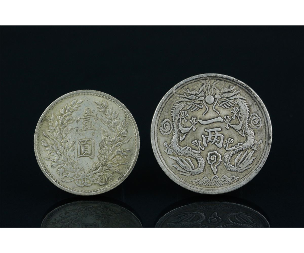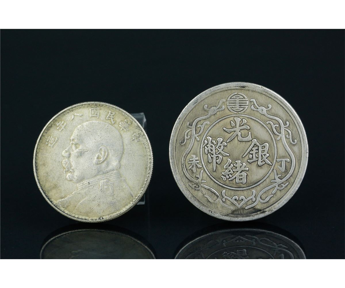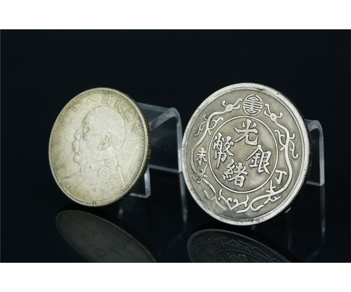 Two pieces of Chinese silver coins; comprised of one Guangxu Yingbi coin and One Yuan Republic coin; D: 42 mm, 36 grams(1/2) ; D: 37 mm, 23 grams(2/2)