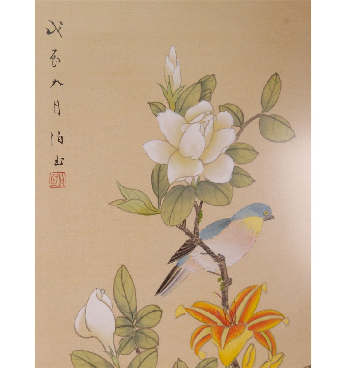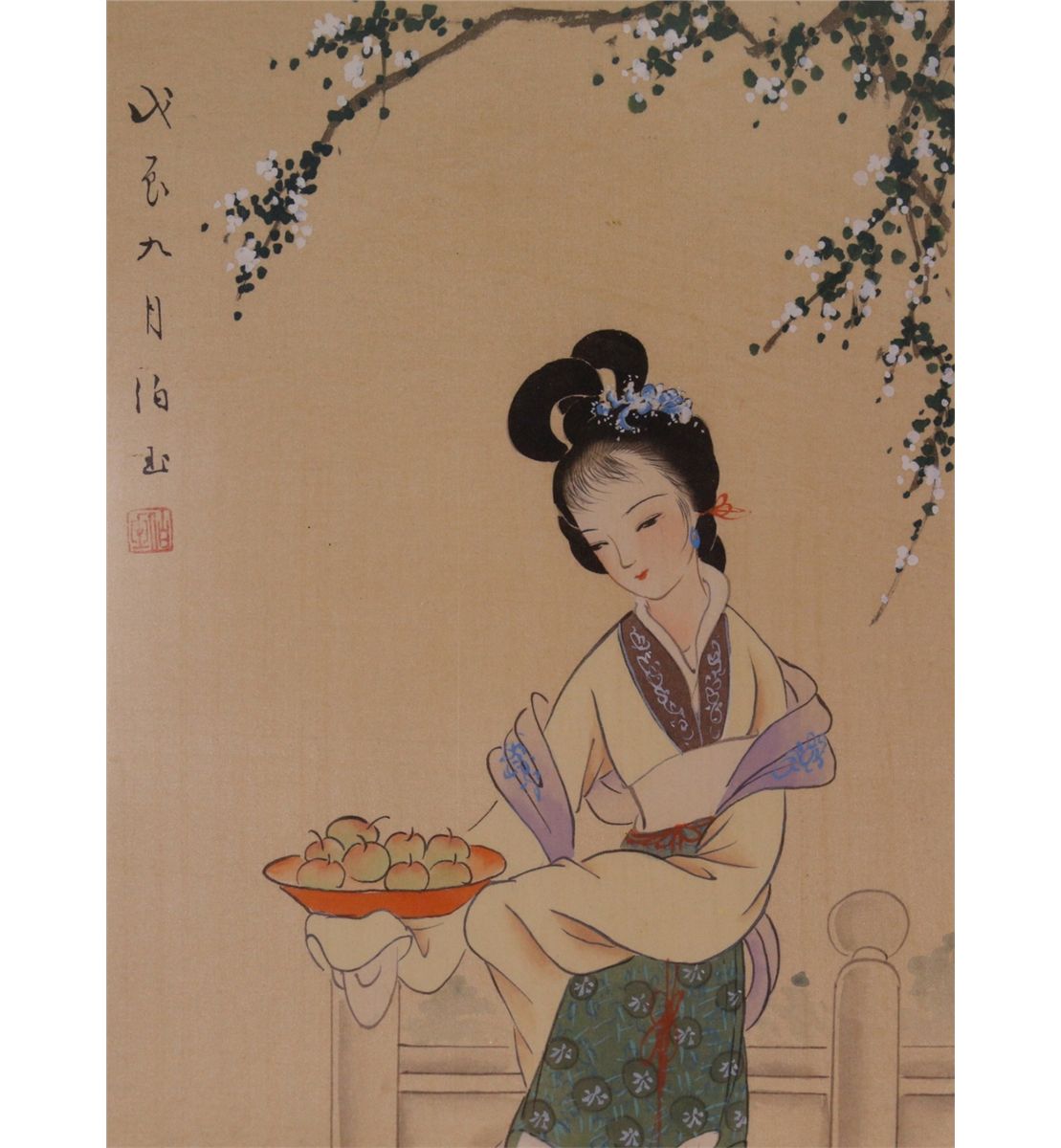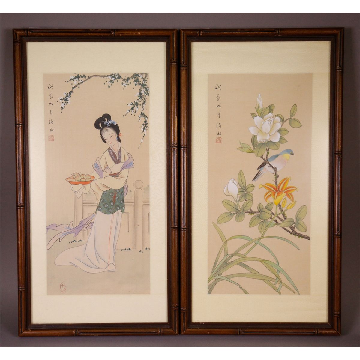 Beautiful lady and bird on prunus branch; two pieces of Chinese framed paintings; watercolour and ink on paper; signed Bo Yu and inscribed with three seals; 35 cm x 16.5 cm, 1579 grams both
