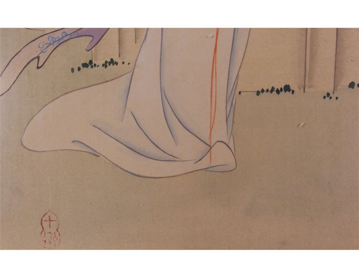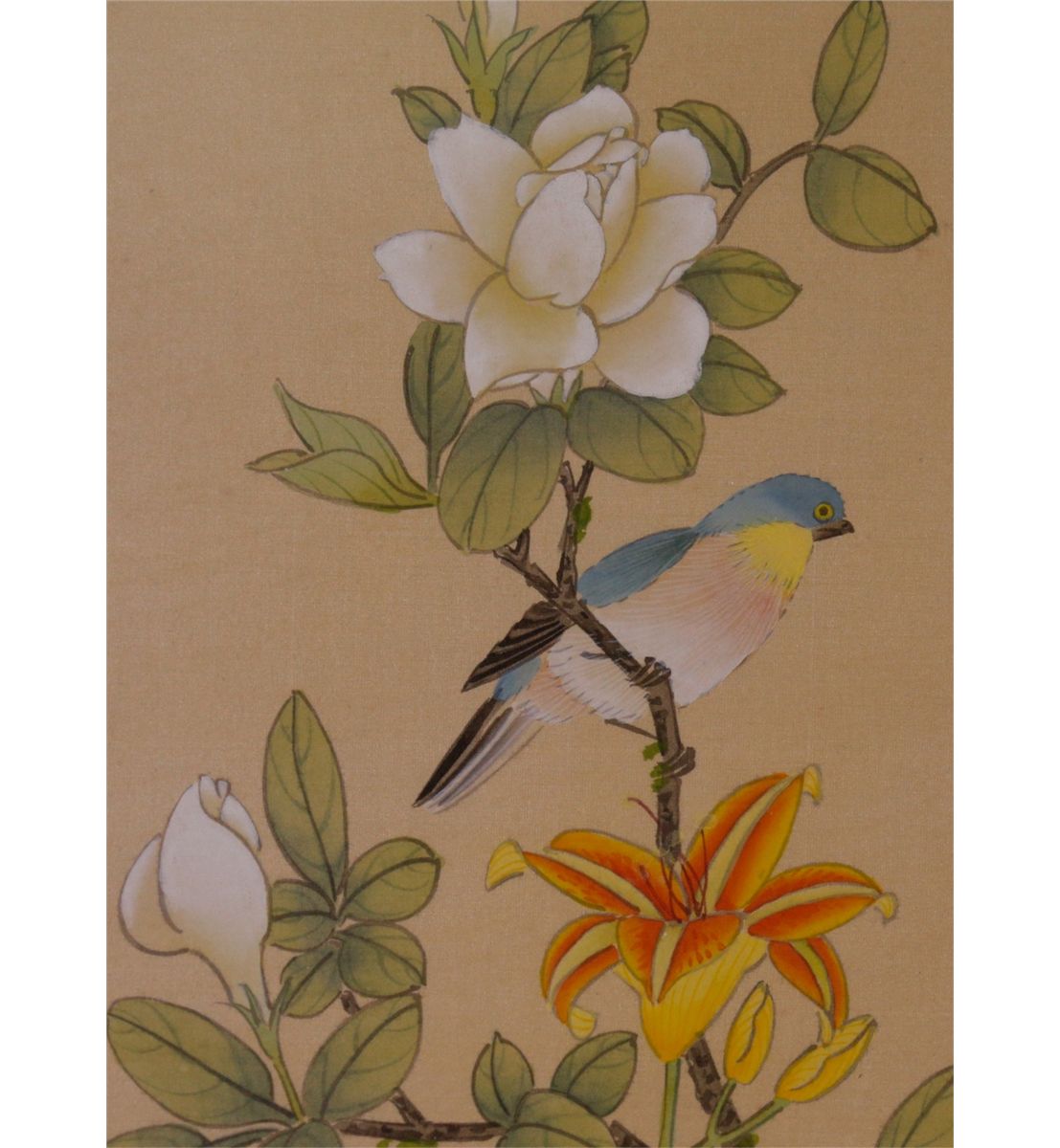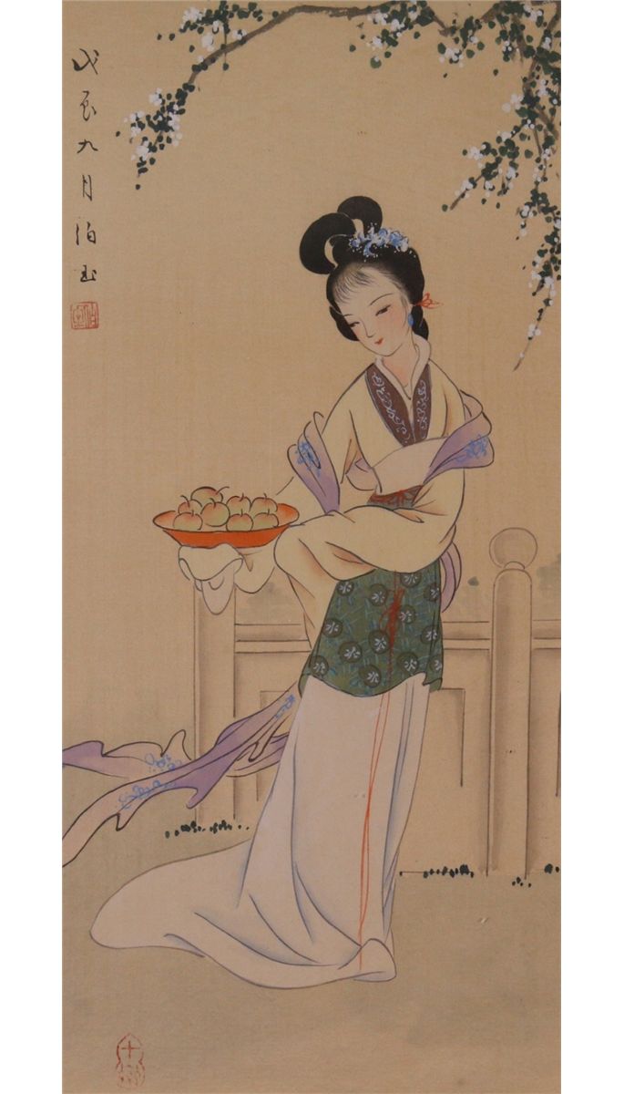 Beautiful lady and bird on prunus branch; two pieces of Chinese framed paintings; watercolour and ink on paper; signed Bo Yu and inscribed with three seals; 35 cm x 16.5 cm, 1579 grams both