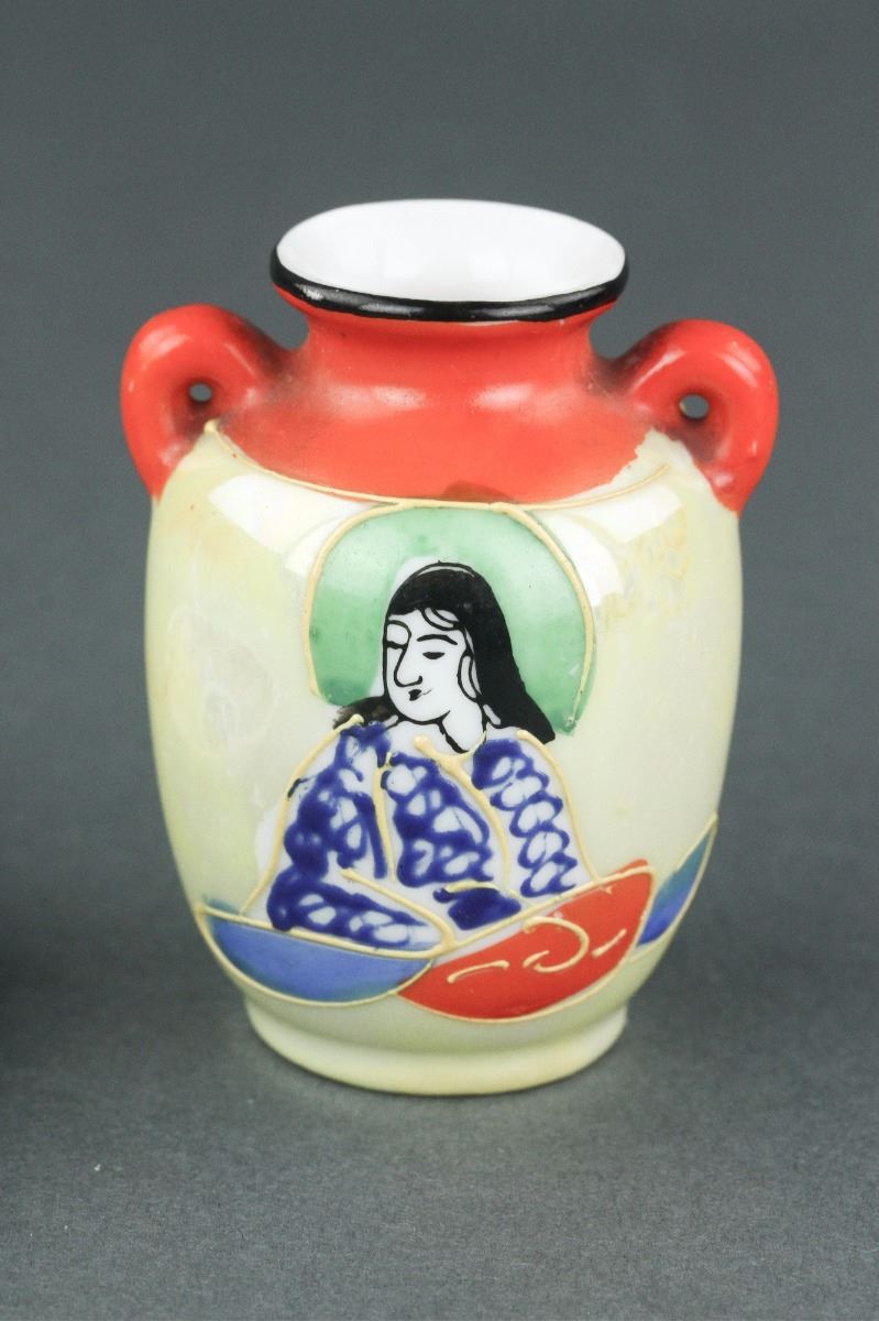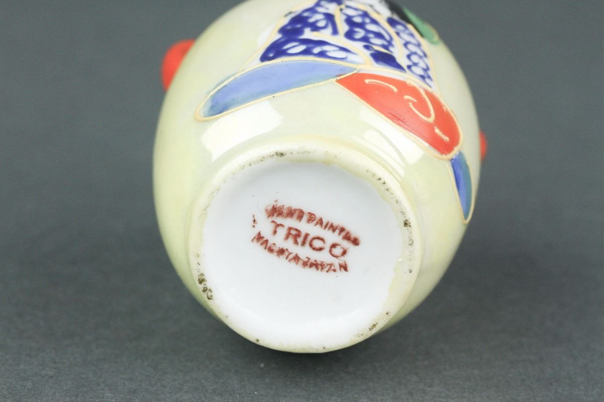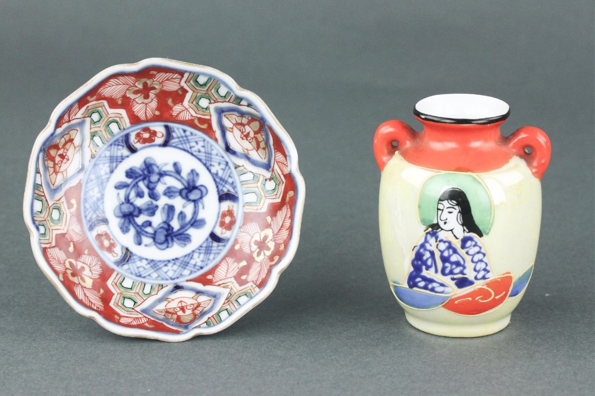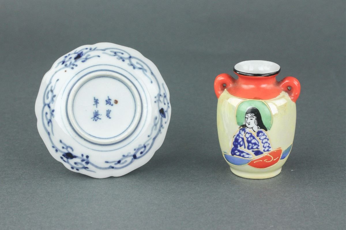 Two pieces of Japanese enameled porcelain saucer and jar; the plate with four-character Chenghua mark on base; the jar with HAND PAINTING TRICO mark on base; H: 6 cm, D: 8 cm, 87 grams total