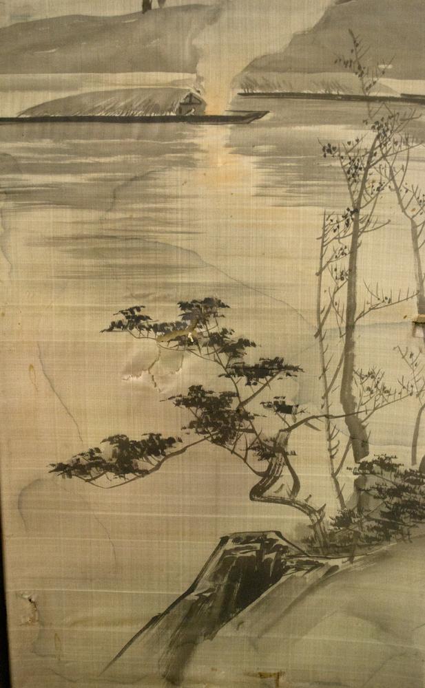 Each screen finely sewn on one side to depict cranes and foliage, three reverse with paintings on silk to depict landscapes wit fine needlework each panel measures 69"H X 24.75"W, small areas of losses to needlework, the painted sides with several areas of losses, probably part of a larger screen lacking hinges, circa 19th century.