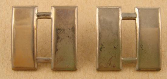 This is a lot of 2 identical WWII era U.S. Military insignia pins for a Captain. These silver-colored, metal Captain's Bars are pin-back style and measure approximately 1" by 1". The pins are in fair to good condition with some scratching, discoloration and normal wear.