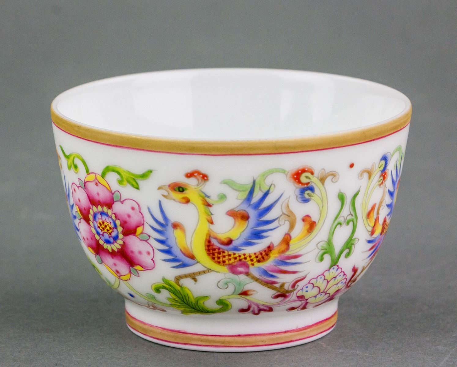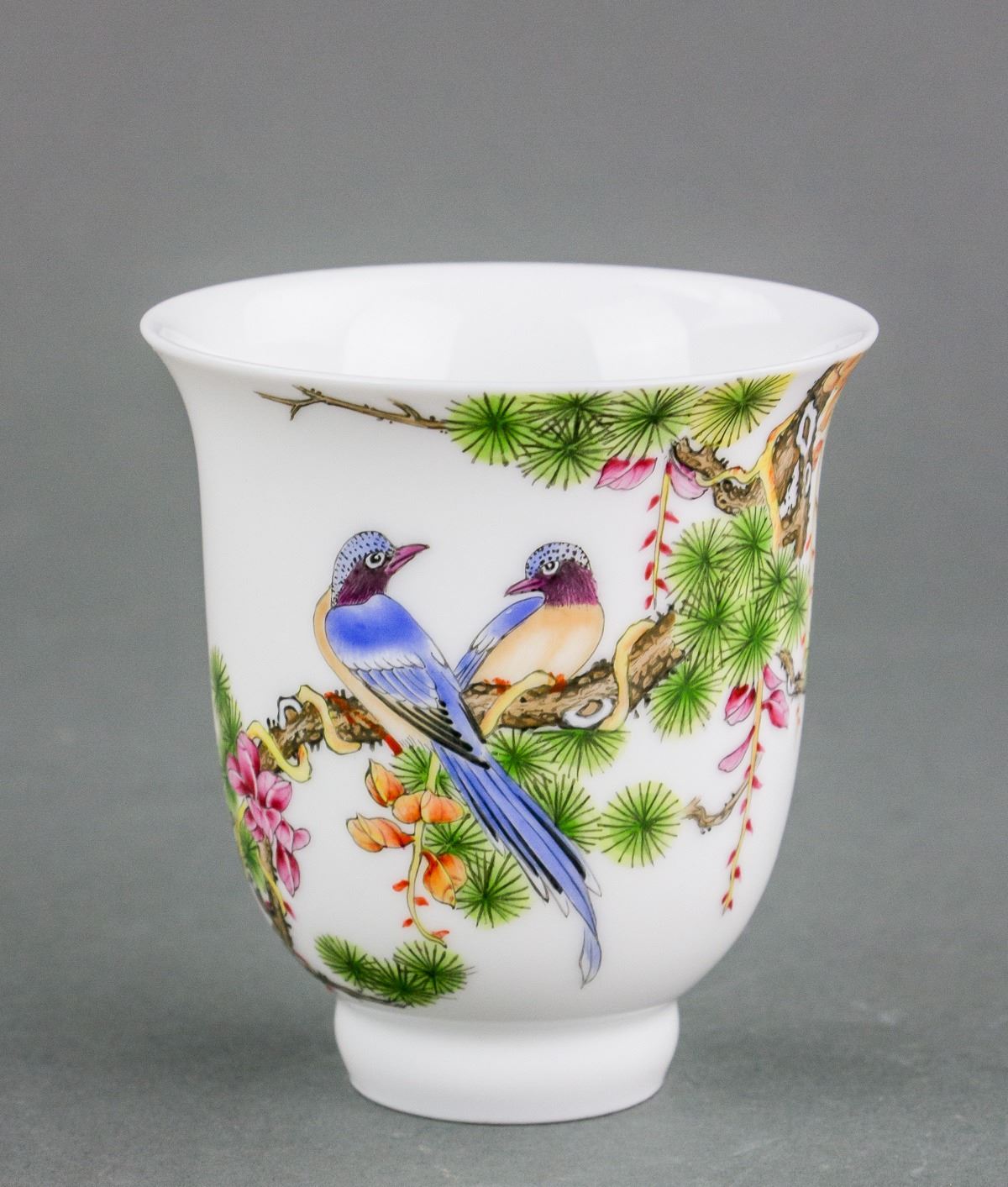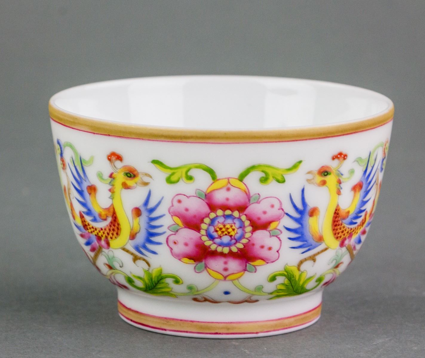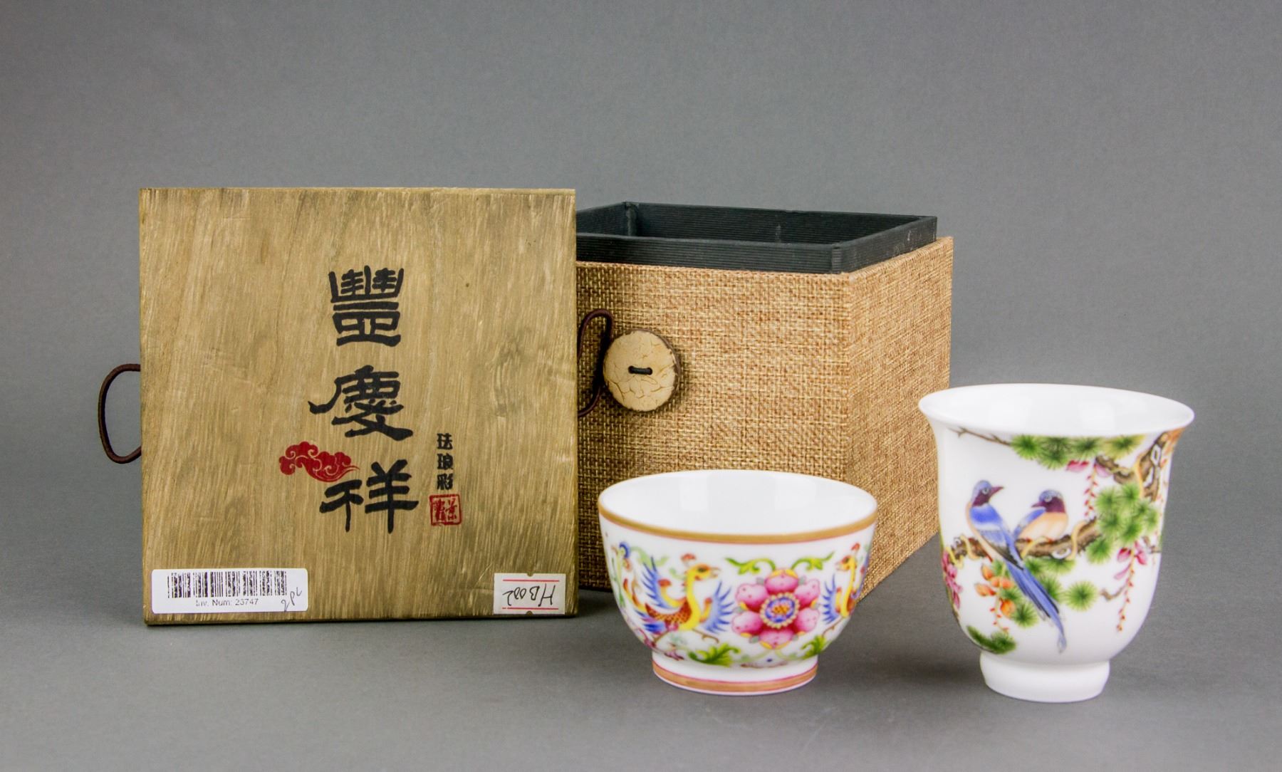 Two pieces of Chinese Jingdezhen porcelain cups; of deep rounded sides with short foot rim; the exterior painted with birds and flowers ; three-character Feng Qing Xiang mark on base; H: 7.5/4.5 cm, D: 6/7.5 cm, 156 grams