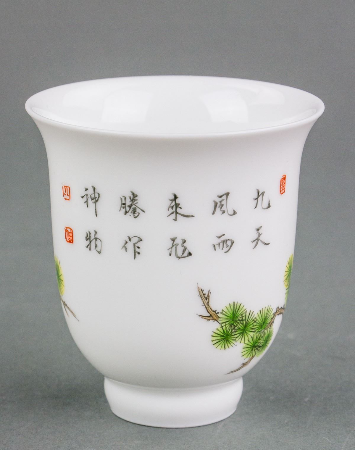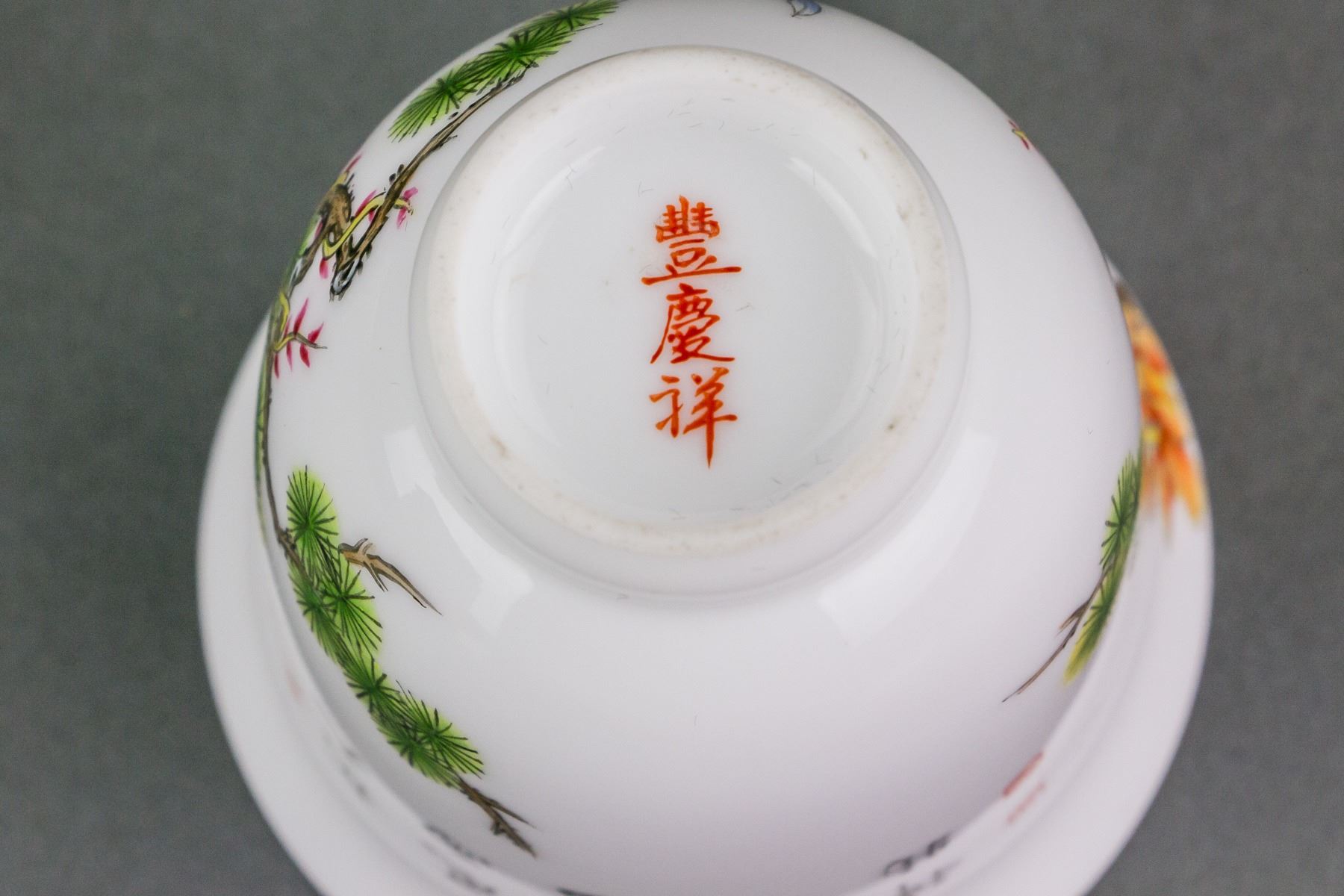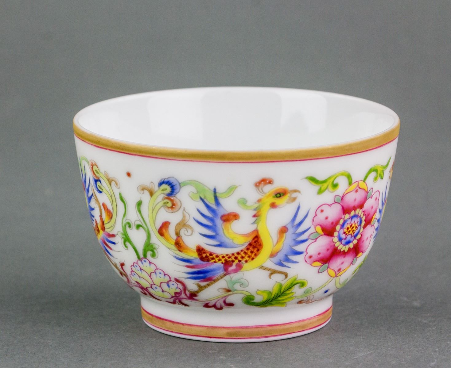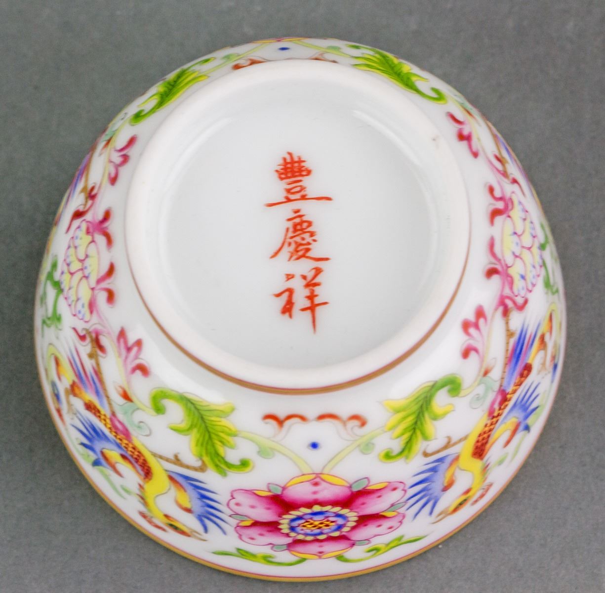 Two pieces of Chinese Jingdezhen porcelain cups; of deep rounded sides with short foot rim; the exterior painted with birds and flowers ; three-character Feng Qing Xiang mark on base; H: 7.5/4.5 cm, D: 6/7.5 cm, 156 grams
