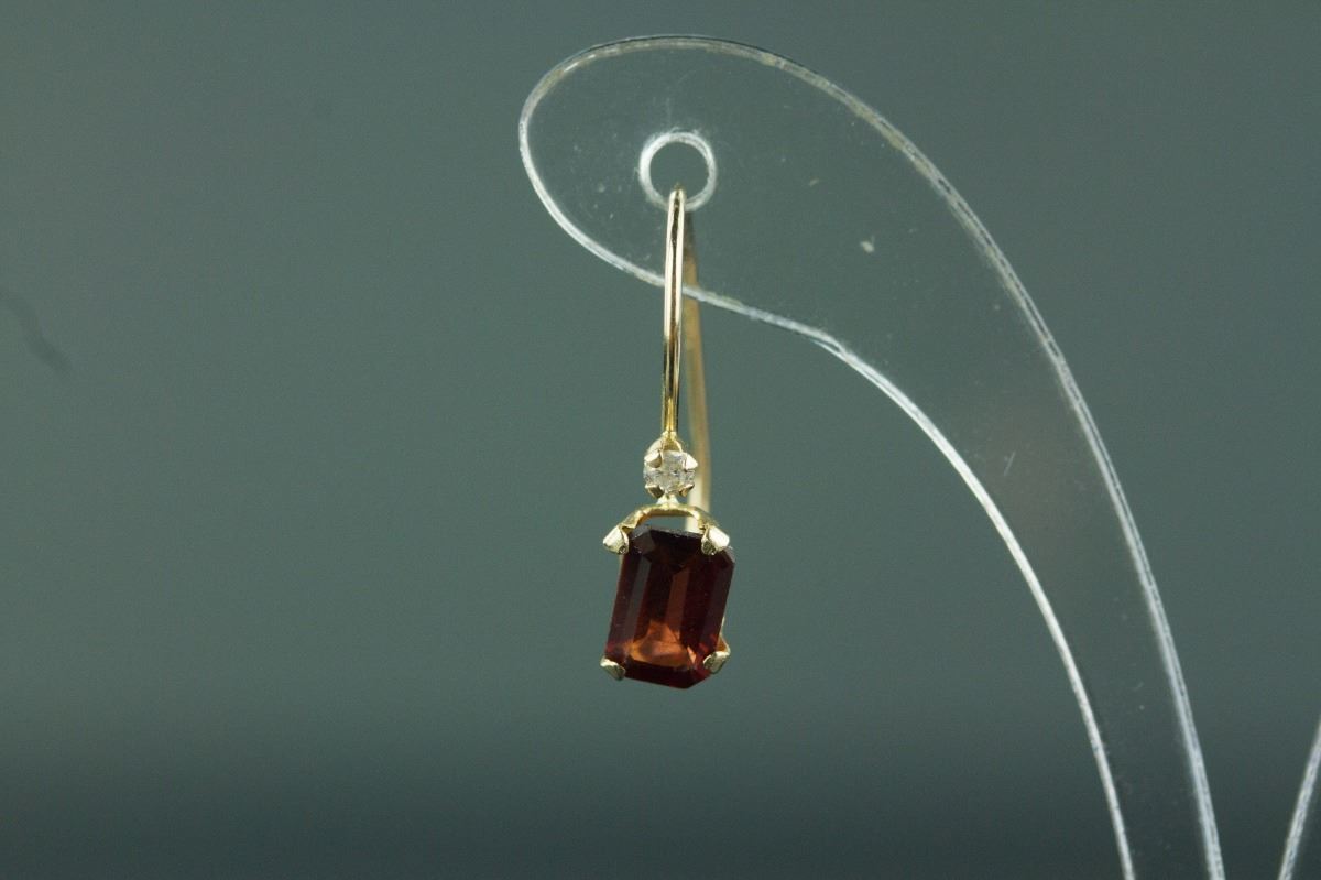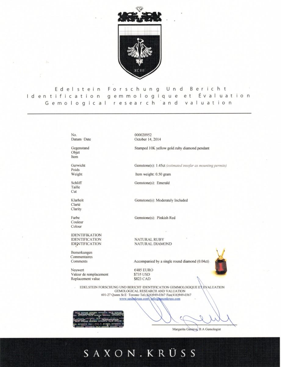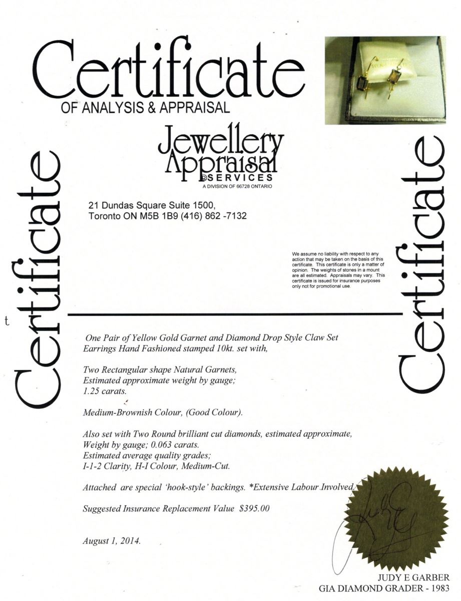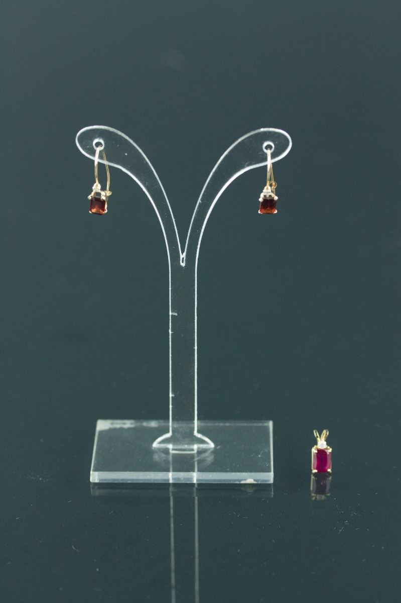 Two pieces jewellery set; comprised of one stamped 10K yellow gold ruby diamond pendant and one pair of 10K yellow gold garnet and diamond drop style earrings; both with certified replacement values