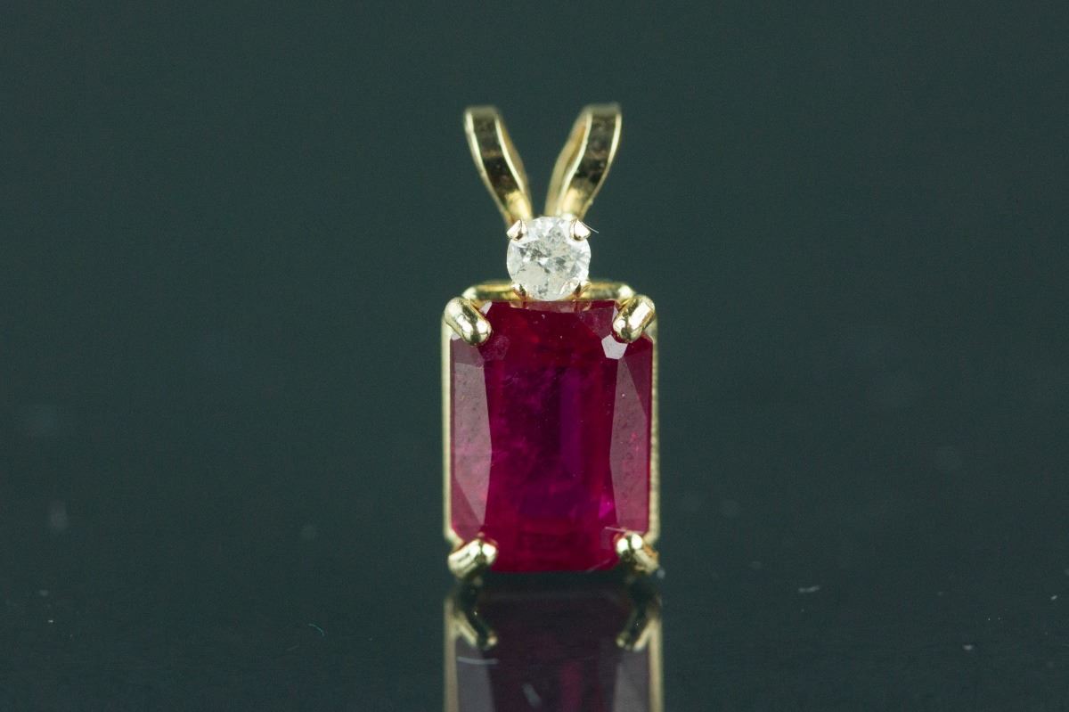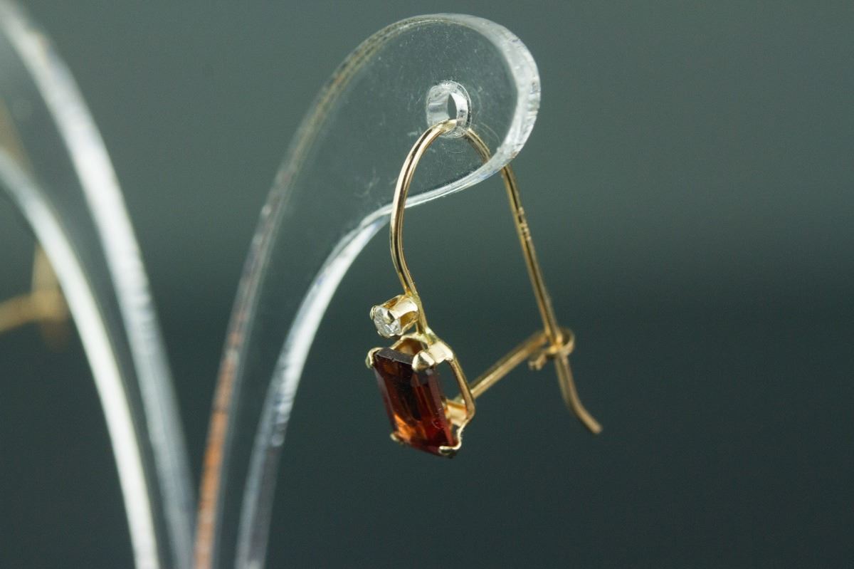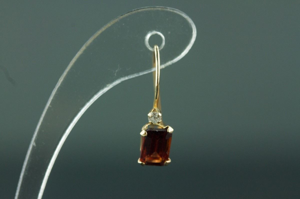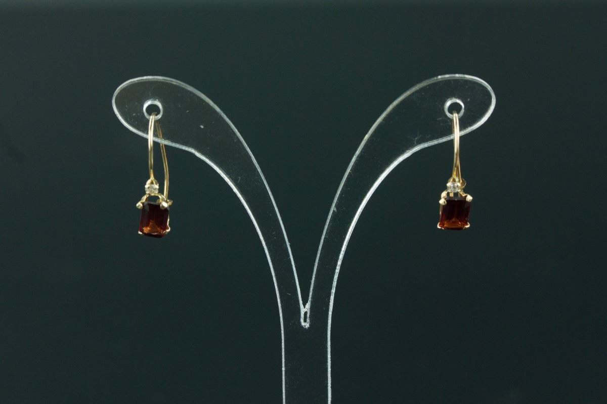 Two pieces jewellery set; comprised of one stamped 10K yellow gold ruby diamond pendant and one pair of 10K yellow gold garnet and diamond drop style earrings; both with certified replacement values