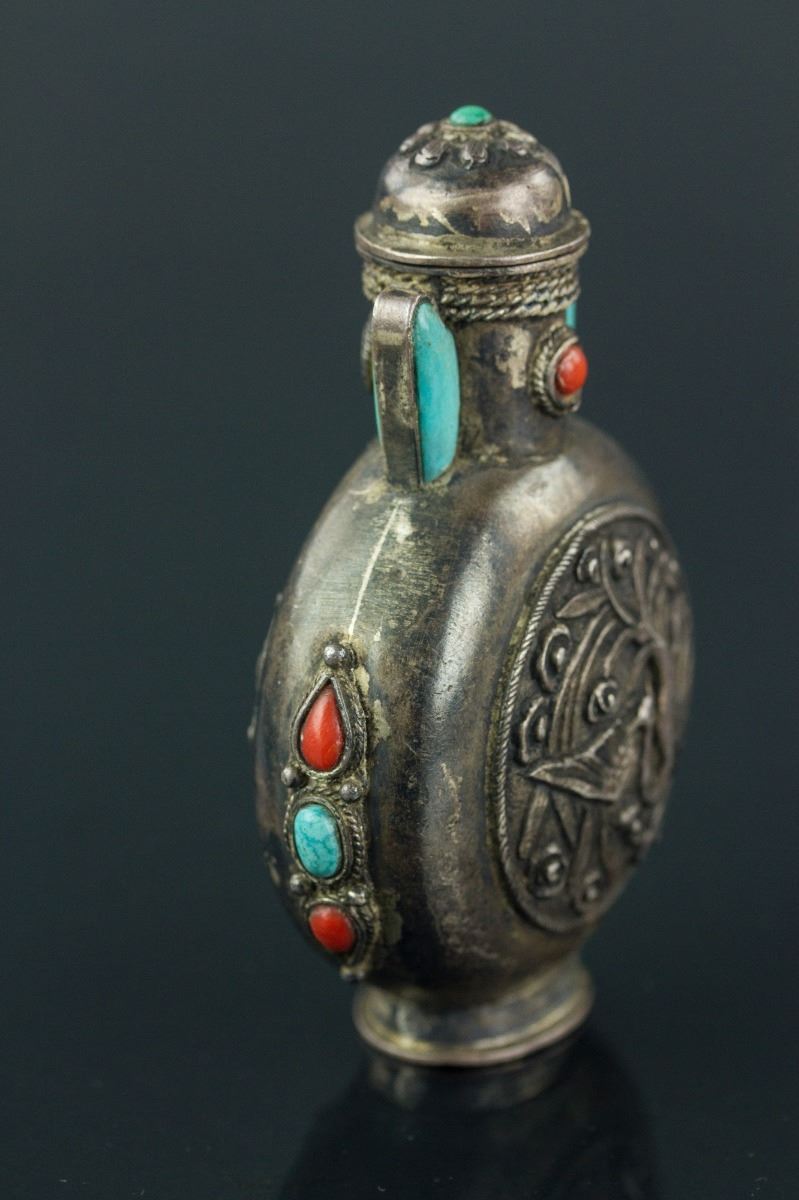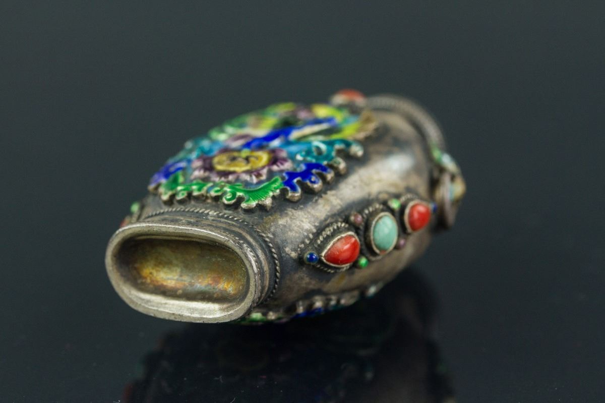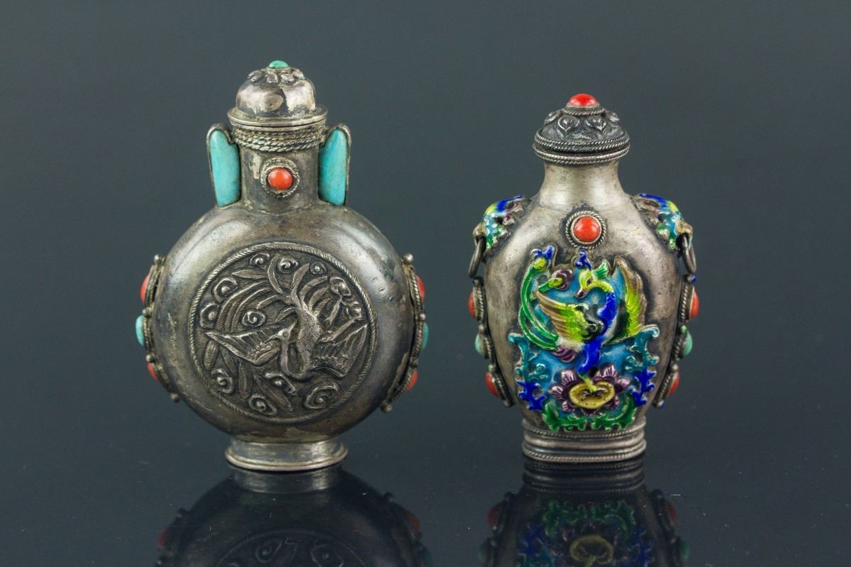 Two pieces of enameled silver snuff bottles; inlaid with a variety of gemstone including turquoise and coral; decorated in low relief with phoenix and floral scrolls; Big: H: 8.5 cm, W: 3 cm, L: 6 cm, 97 grams, Small: H: 7.5 cm, W: 2.5 cm, L: 5 cm, 82 grams