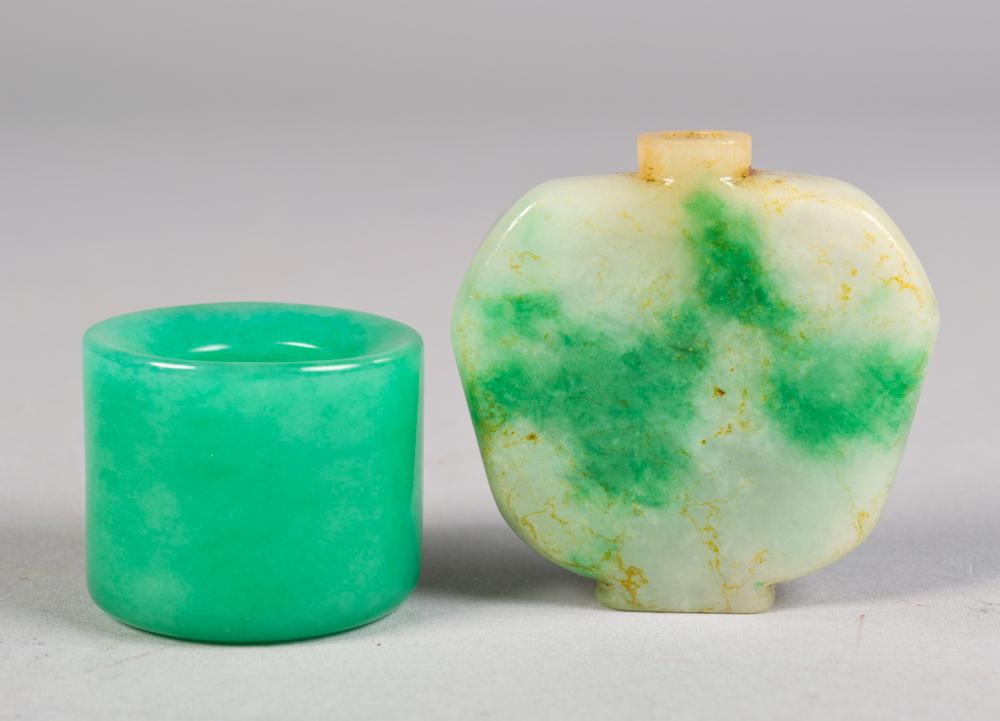 To include a carved snuff bottle with faceted sides the stones with apple green inclusions together with a jadeite thumb ring both with fine polish largest is 2.25"H circa late 19th-early 20th century.