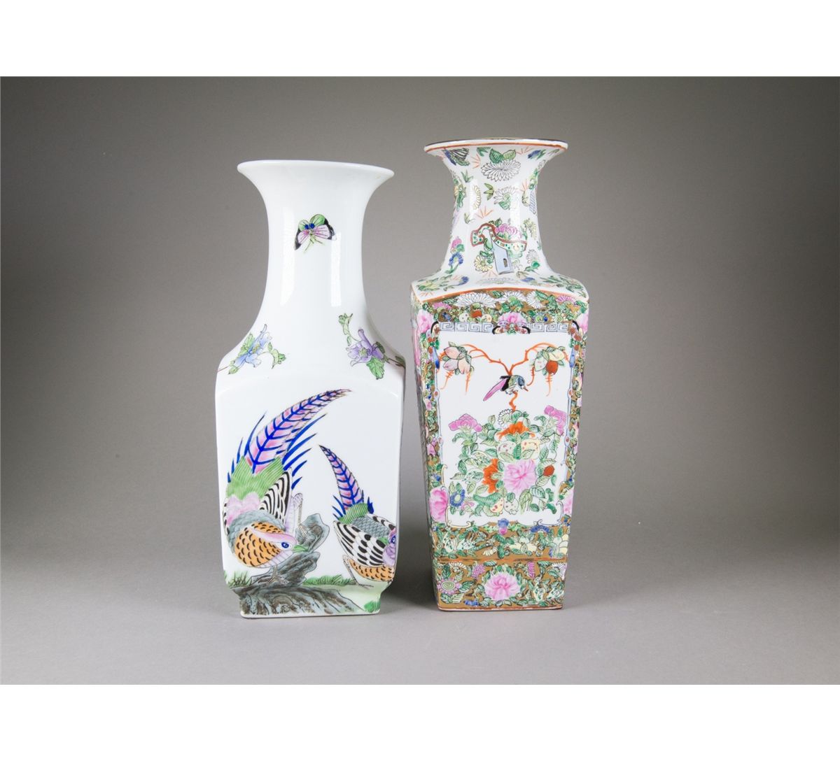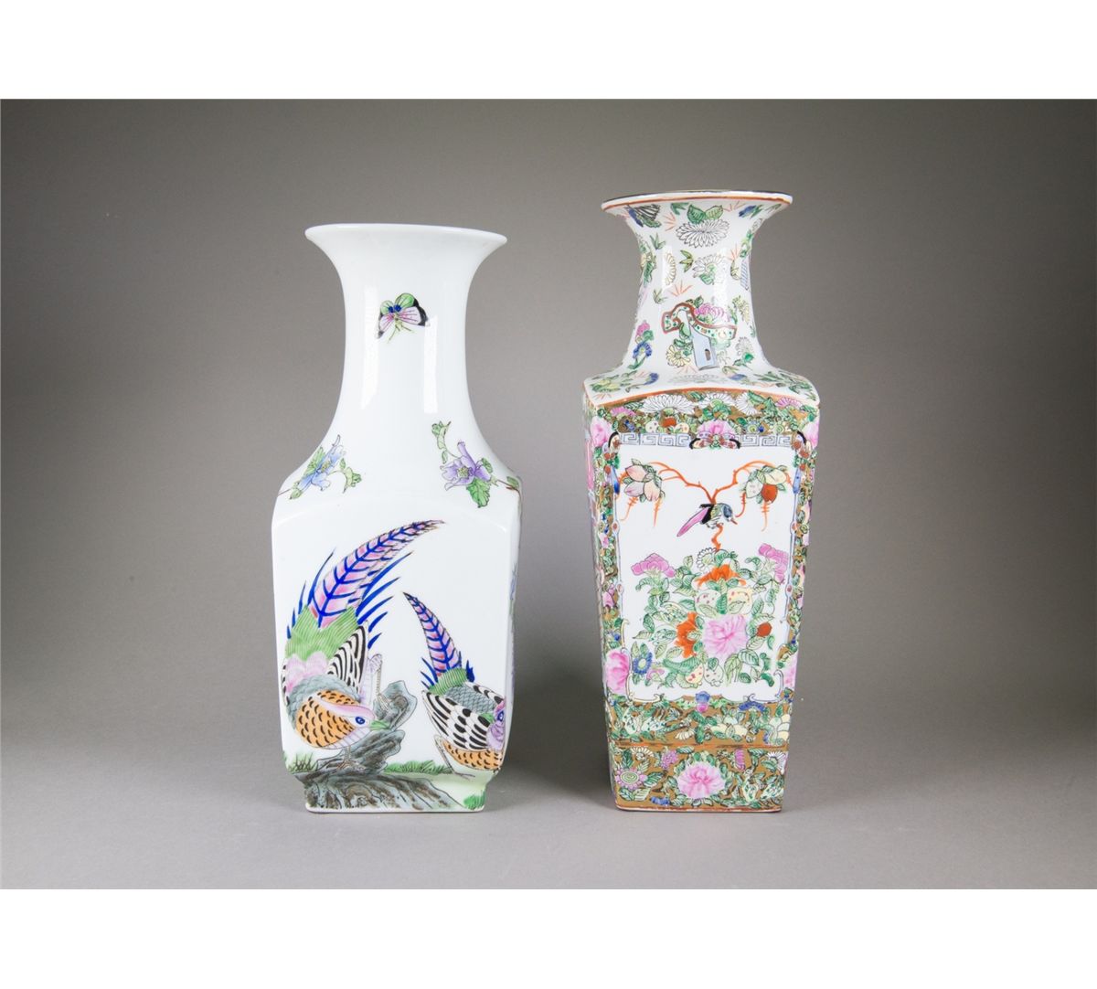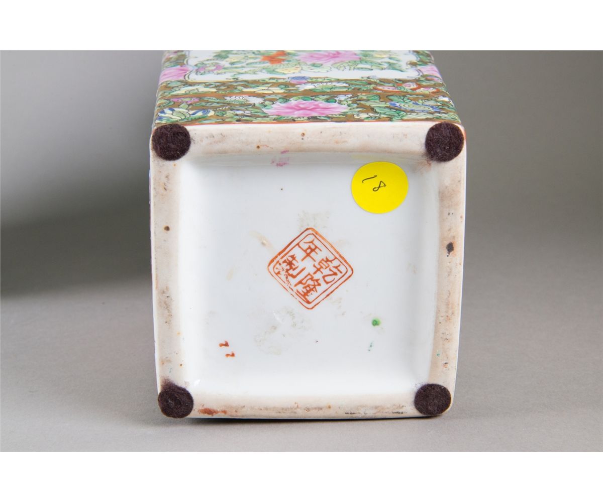 Two pieces of Chinese Famille Rose square porcelain vases; featuring flowers and birds; four-character Qianlong mark on base; H: 39 cm, W: 13 cm, 2219 grams(1/2) H: 37 cm, W: 14 cm, 2424 grams(2/2)