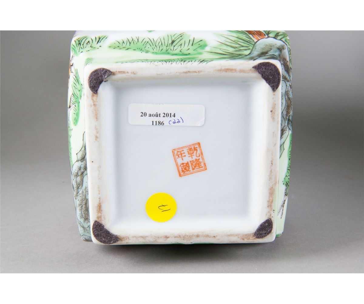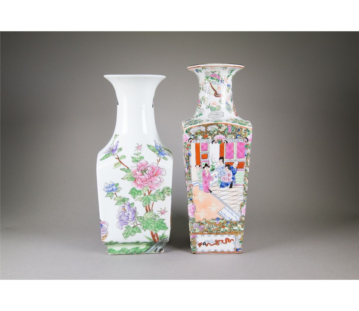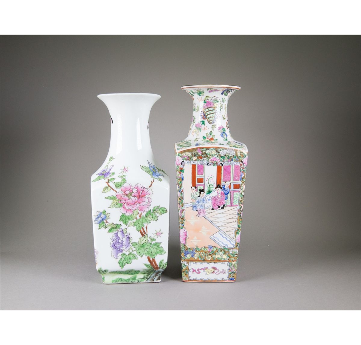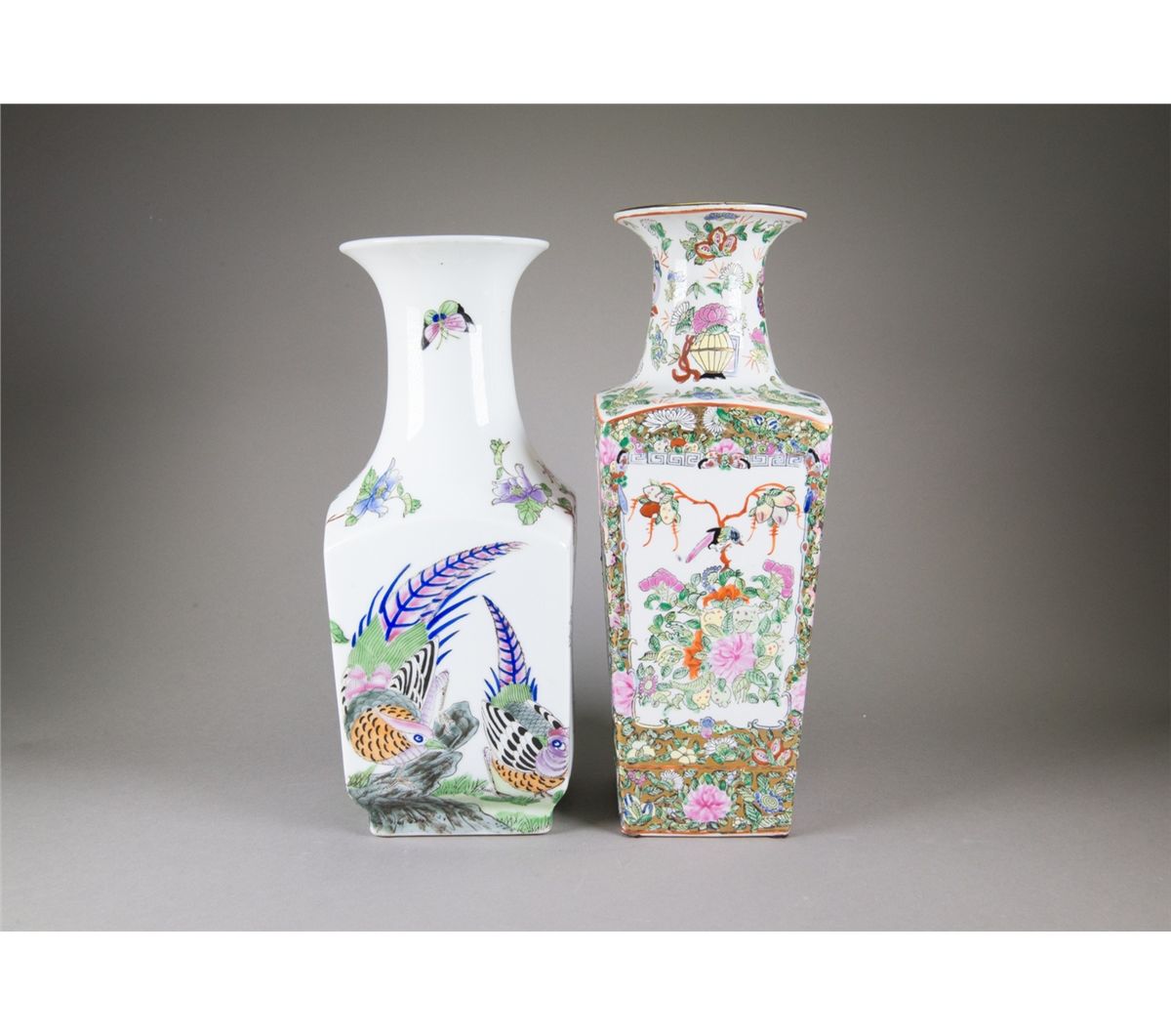 Two pieces of Chinese Famille Rose square porcelain vases; featuring flowers and birds; four-character Qianlong mark on base; H: 39 cm, W: 13 cm, 2219 grams(1/2) H: 37 cm, W: 14 cm, 2424 grams(2/2)