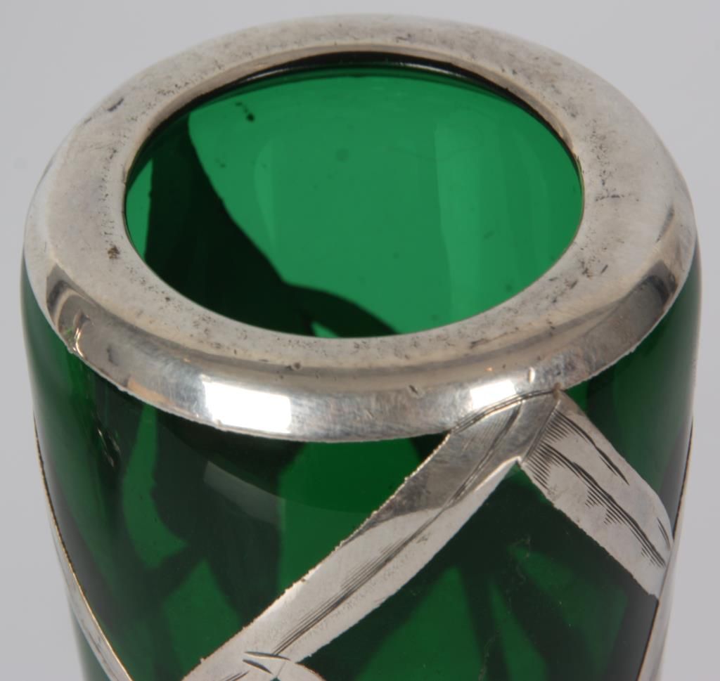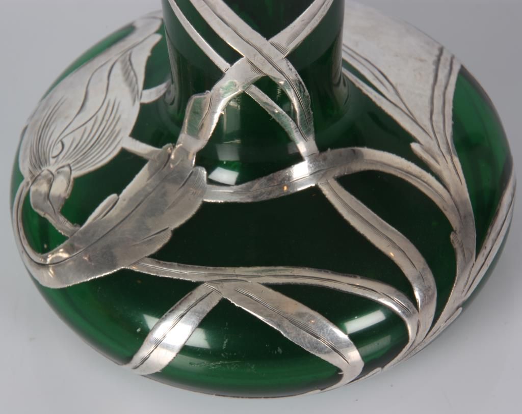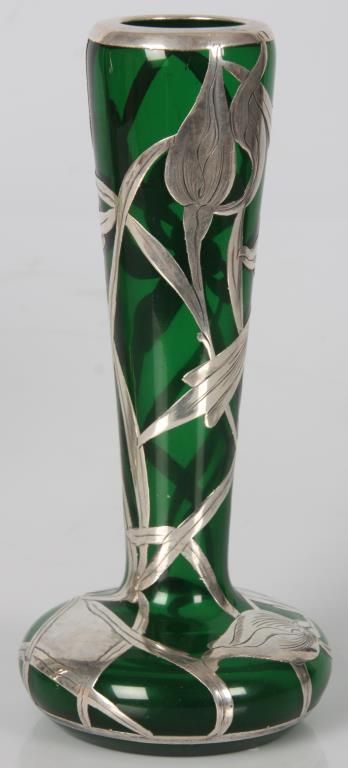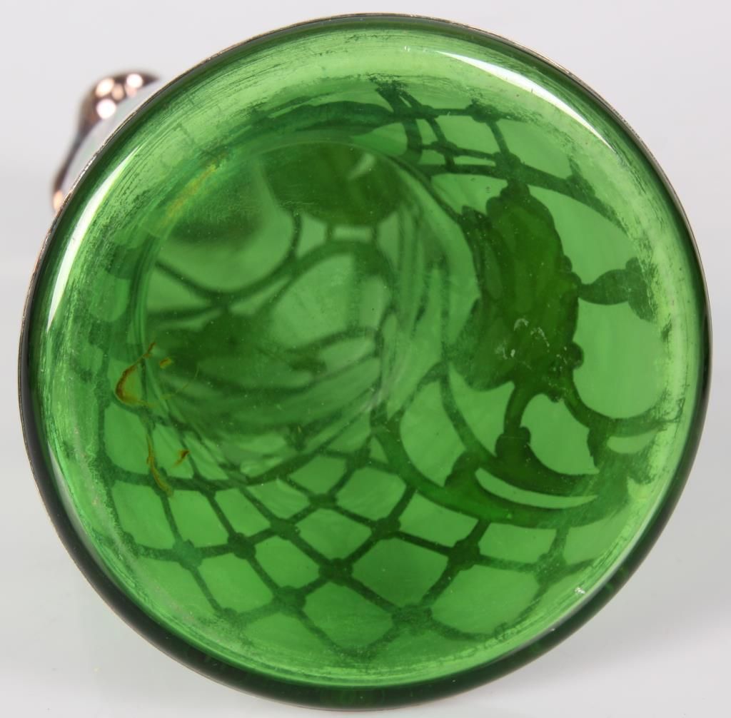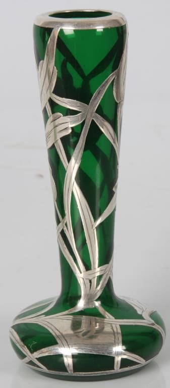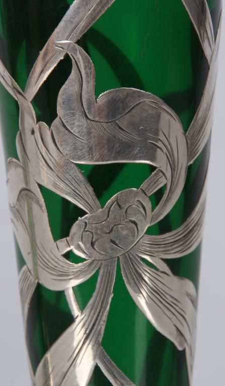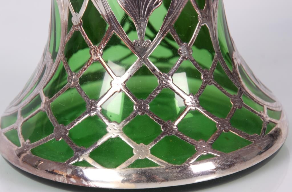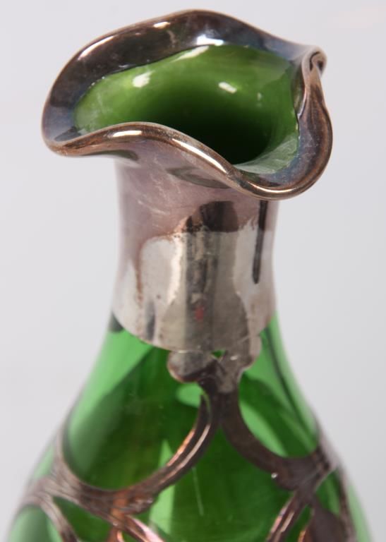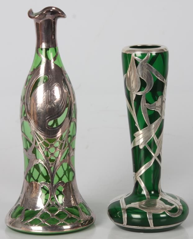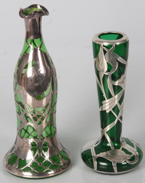 2 Pcs. Green Glass With Silver Overlay. Emerald green glass vase has a trumpeted neck with bulbous base, overlaid with floral, leaf, stem and bud design, marked Sterling; 8 in. high. The green glass decanter has a pinched mouth and a trumpeted base, overlaid with pierced floral and filigree designs and monogrammed on the front, 9.5 in. high; not signed or marked, missing stopper. Both are in good condition with no breaks, chips, cracks or losses.