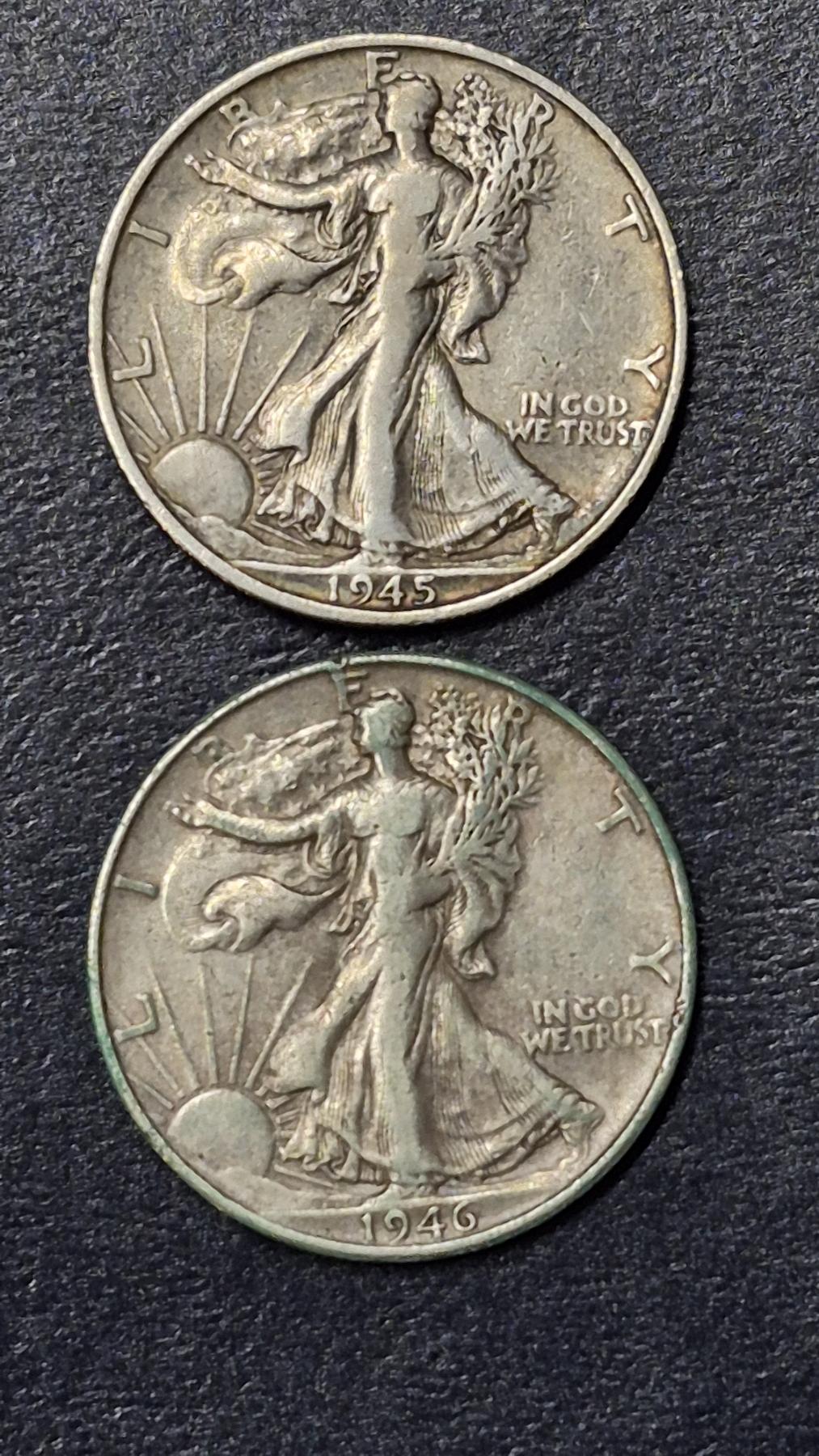2 Pcs - Walking Liberty 90% Silver Halves - 1945 S - 1946 S -  See Pics for condition