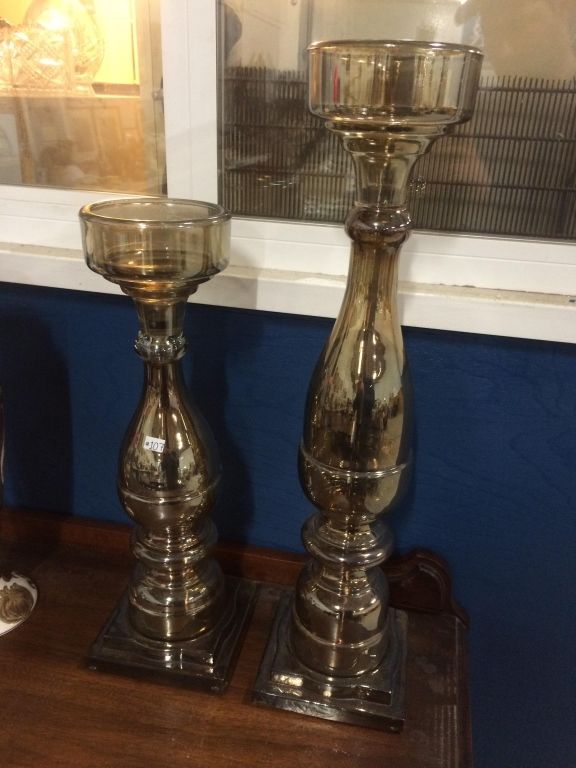2 Pedestal Glass Candle Holders (18.5" and 23.5" high)
