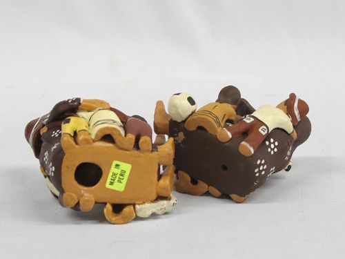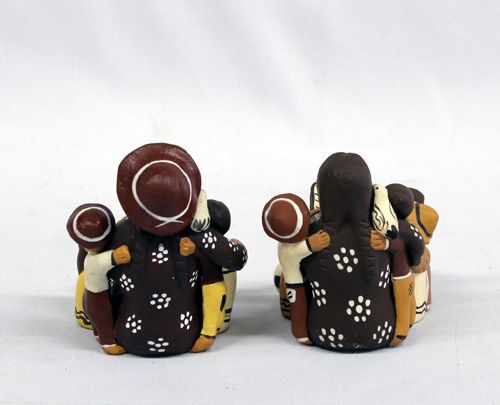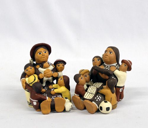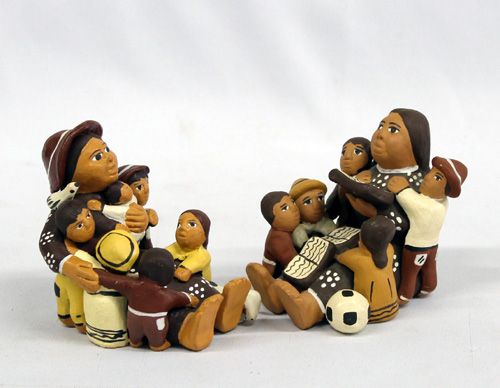 2 Peruvian Pottery Storyteller Figures. Two charming creations, each has a mama with many interested children hanging on to hear a story. One lady is reading books and the other is talking from memory. Each is about 3.75''H x 3''W x 3.75''D.