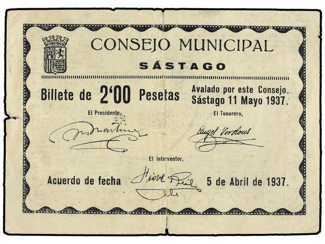 2 Pesetas. 11 Mayo 1937. C.M. de SÁSTAGO (Zaragoza). (Pequeñas roturas). Mont-1337B. MBC.
