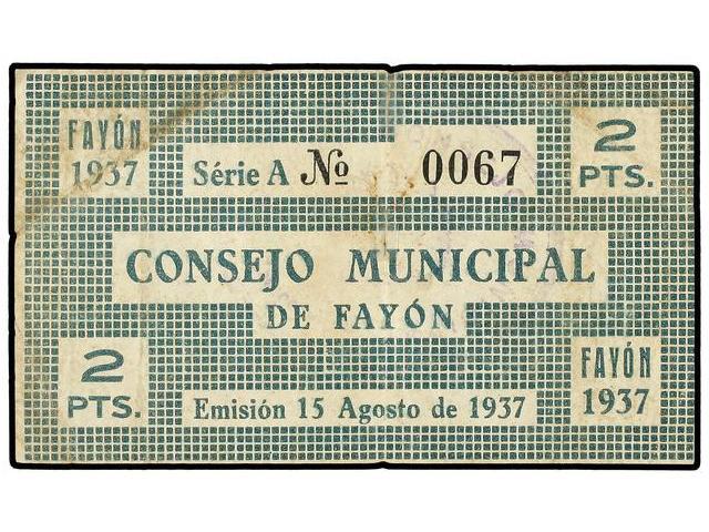 2 Pesetas. 15 Julio de 1937. C.M. de FAYÓN (Zaragoza). (Pequeñas roturas, una reparada) Algo sucio. MUY ESCASO. Mont-636/C. MBC-.
