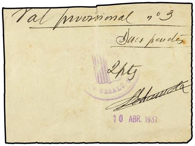 2 Pessetes. - 10 Abril 1937. - Aj. de BESALÚ. - (Doblez vertical). MUY RARO. AT-426; T-502. EBC-. - -