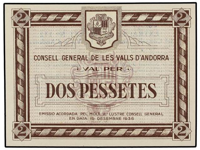 2 Pessetes. - 19 Desembre 1936. - CONSELL GENERAL DE LES VALLS D´ANDORRA. - Castaño. RARO EN ESTA CONSERVACIÓN. Ed-And5. SC. - -