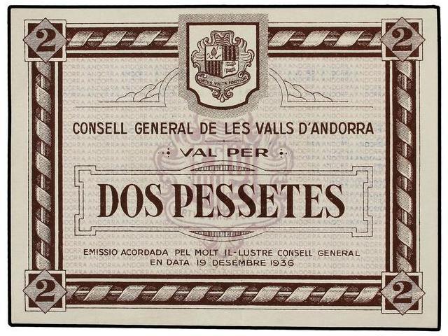 2 Pessetes. - 19 Desembre 1936. - CONSELL GENERAL DE LES VALLS D´ANDORRA. - Castaño. (arruguitas). Ed-AND5. EBC+. - -