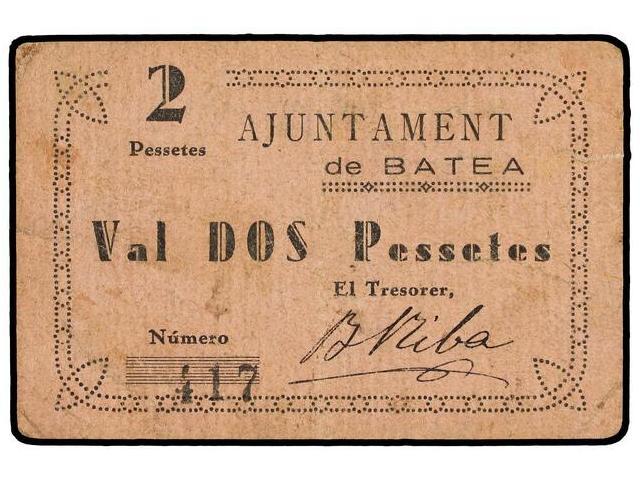 2 Pessetes. Aj. de BATEA. Cartón. RARO. AT-318; T-383. MBC+.