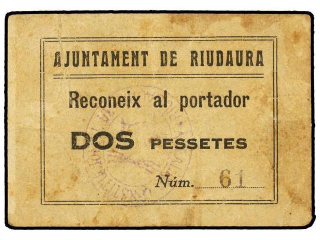 2 Pessetes. Aj. de RIUDAURA. Cartón. (Manchas). MUY RARO. AT-2148; T-2485. MBC+.