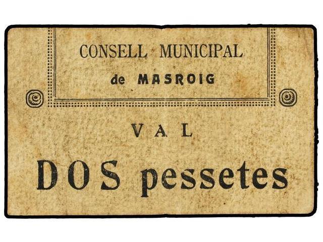 2 Pessetes. C.M. de MASROIG. Cartón. (Algo sucio). RARO. AT-1476; T-1690. MBC.