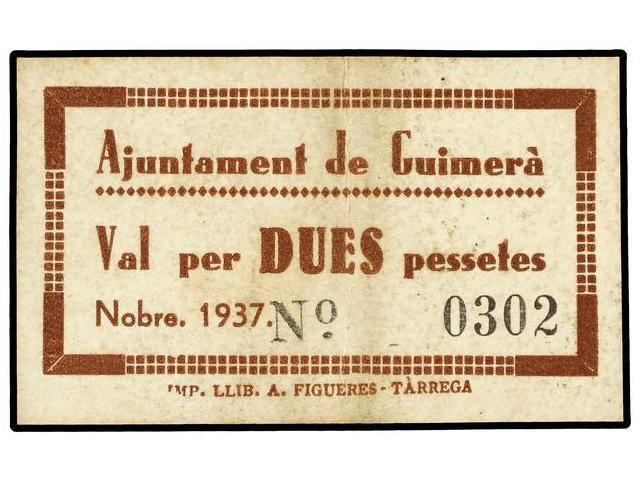 2 Pessetes. Novembre 1937. Aj. de GUIMERÀ. Cartón. RARO. AT-1219; T-1396. EBC-.