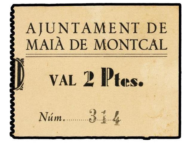 2 Pessetes. S/F. Aj. de MAIÀ DE MONTCAL. Cartón. MUY RARO. AT-1393a; T-1590a. EBC.