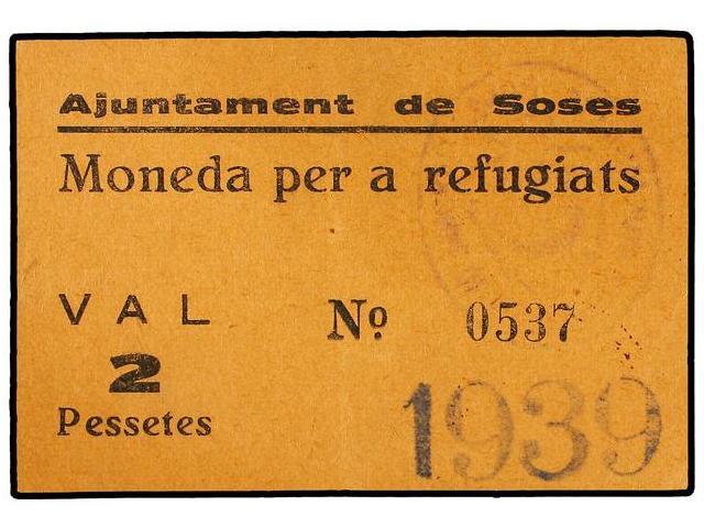 2 Pessetes. S/F. Aj. de SOSES. Moneda per a refugiats. Tampón 1939 en anverso. MUY RARO. AT-2405. EBC.