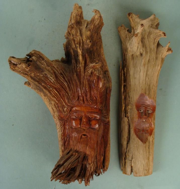 These two portions of tree trunks were hand carved into incredible faces. The artist, Pete Cobb, is talented in providing detailed features, as well as making the faces blend in with the natural form of the tree. The large carving is an old man with beard that flows into slivers of wood. The dimensions are 20 x 12 x 7 inches. The other is a bearded man with bow tie, with single tooth and eyes colored white. This one is signed on back. The dimensions are 20 x 4 x 5 inches. * These are wonderful and magical, from a talented carving artist.