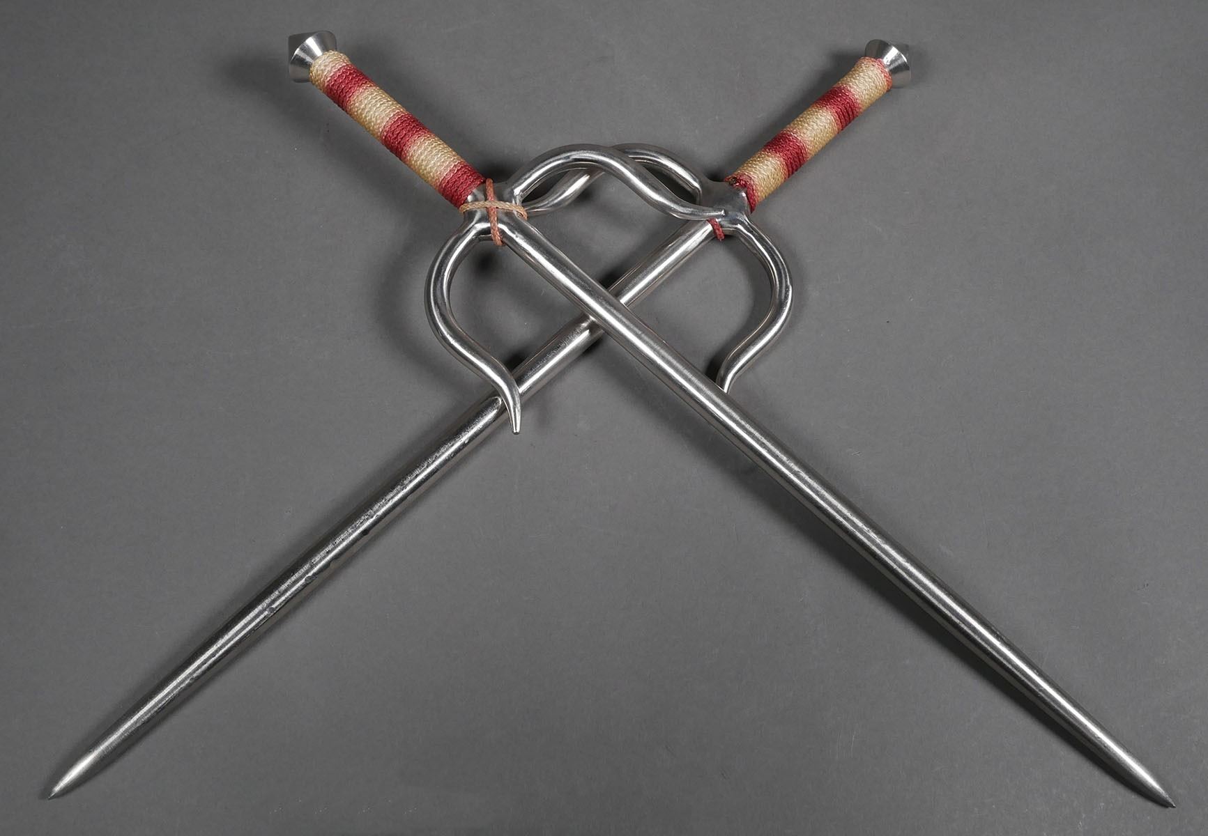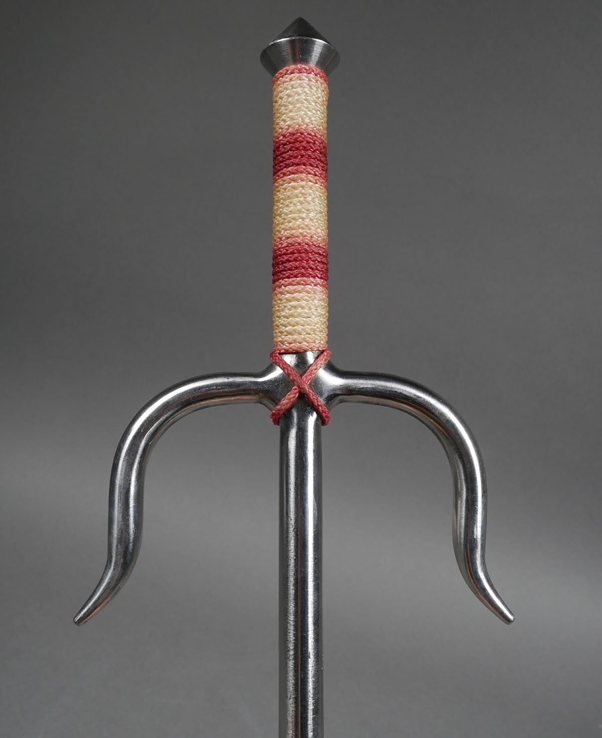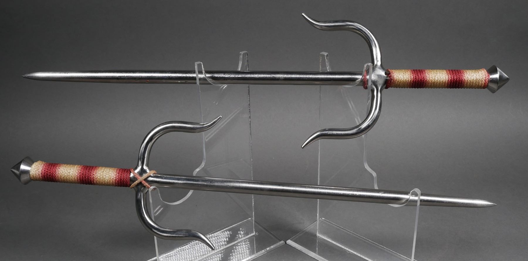 Sai handcrafted by Hanshi Peter Carbone. Cloth cord wrapped tsuka 5" to end of tsukagashira. 3" yoku. 14" monouchi. 19 1/2" overall length. Good condition with normal to light wear. Approx. 1lb 10oz each. See photos for more details on condition.