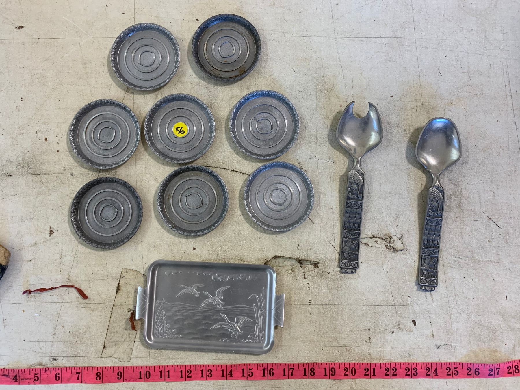 2- Pewter Norway Spoons + Tray & 8- Coasters