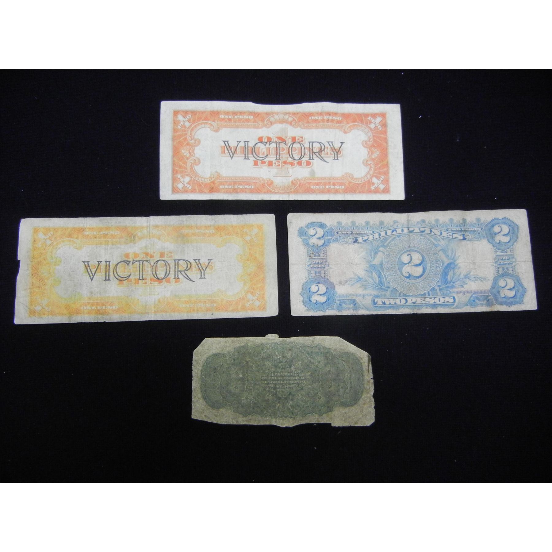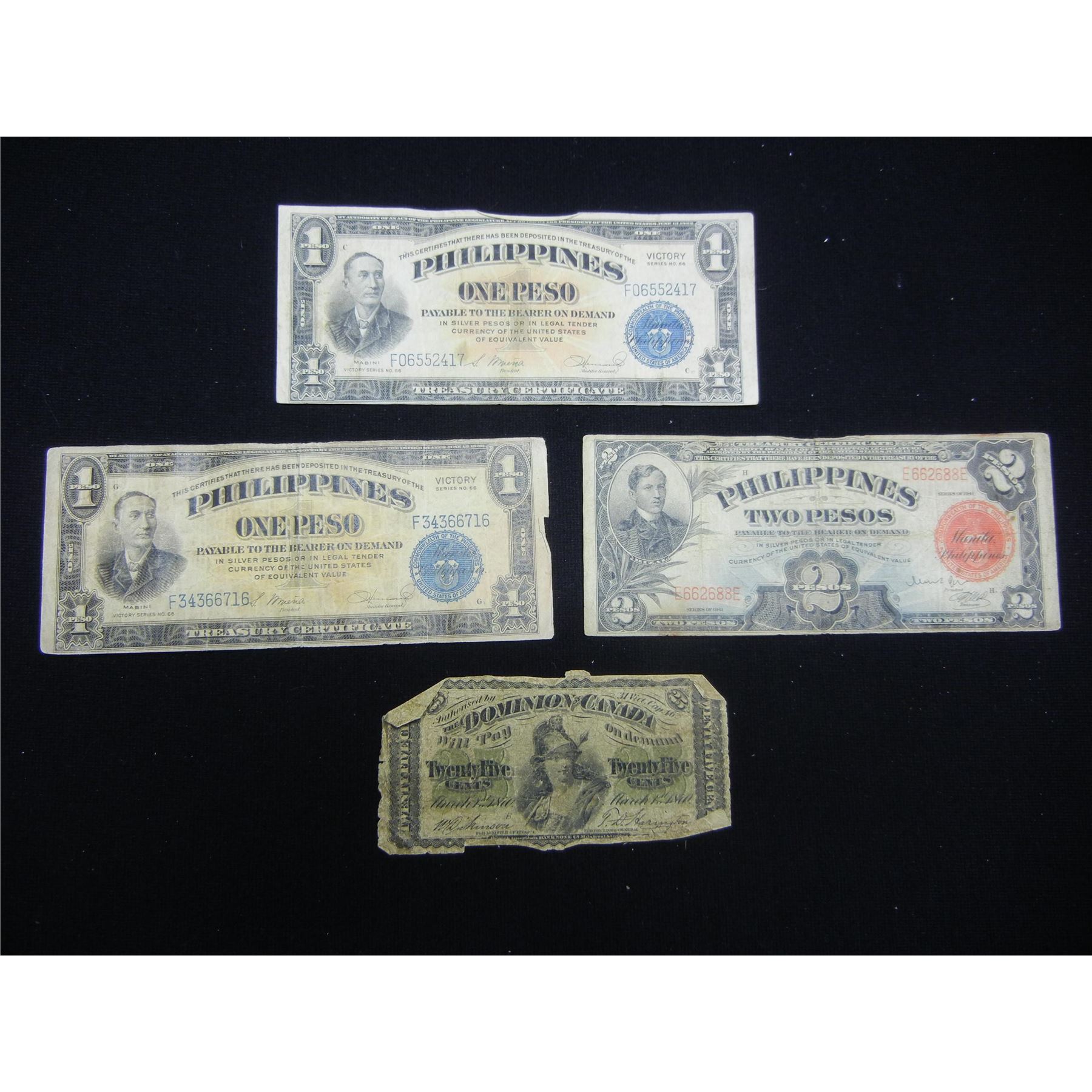 (2) Phillipines One Peso Notes (1) Two Dollar Peso (1) Twenty Five Cent Fractional Canada Note