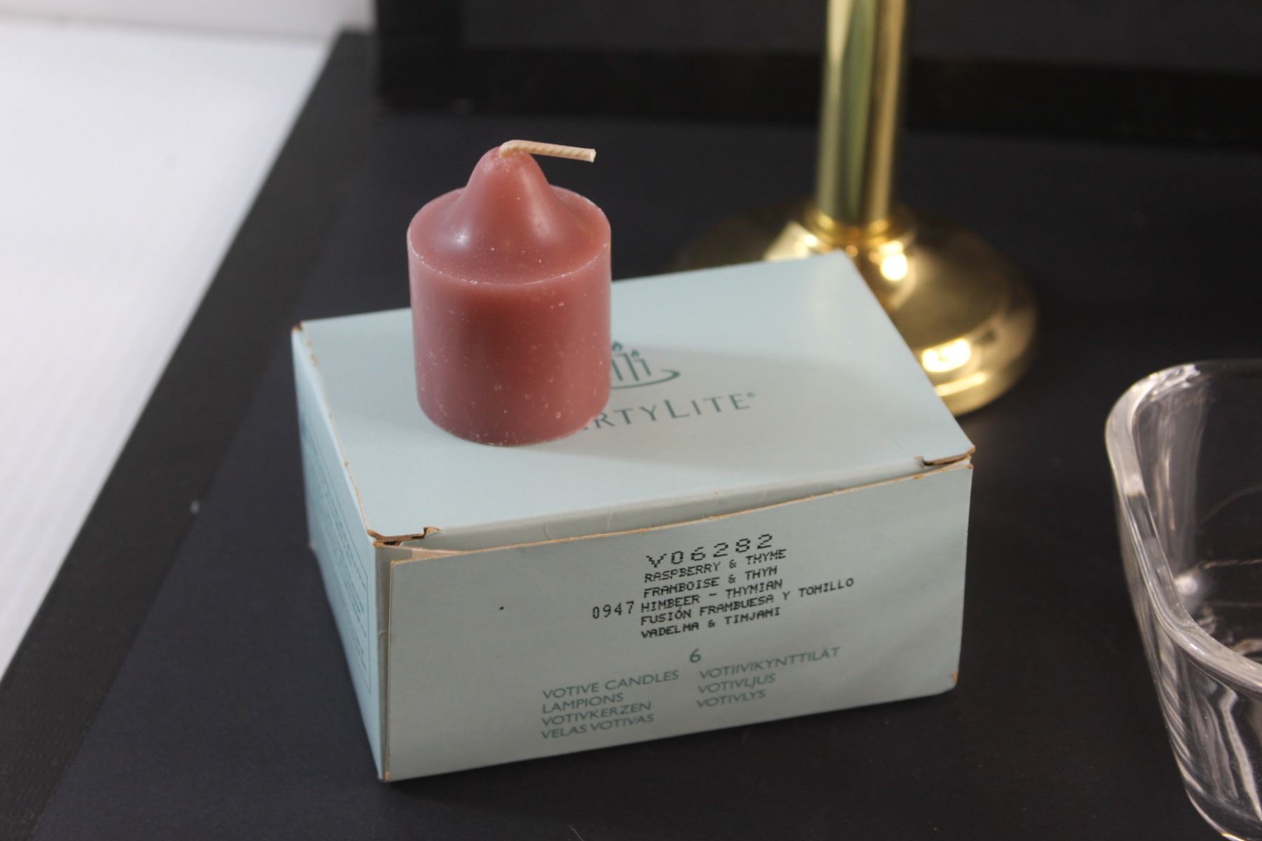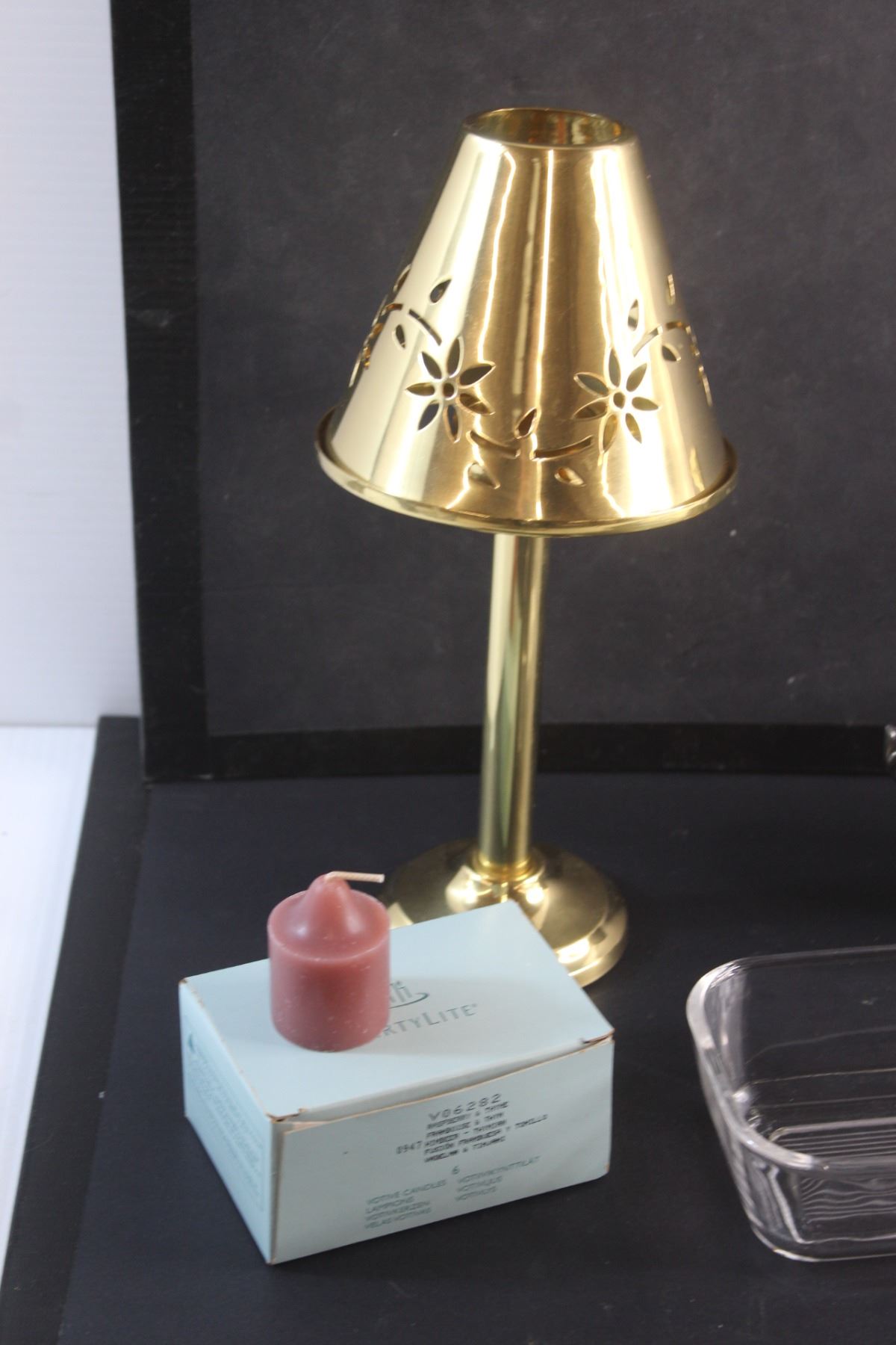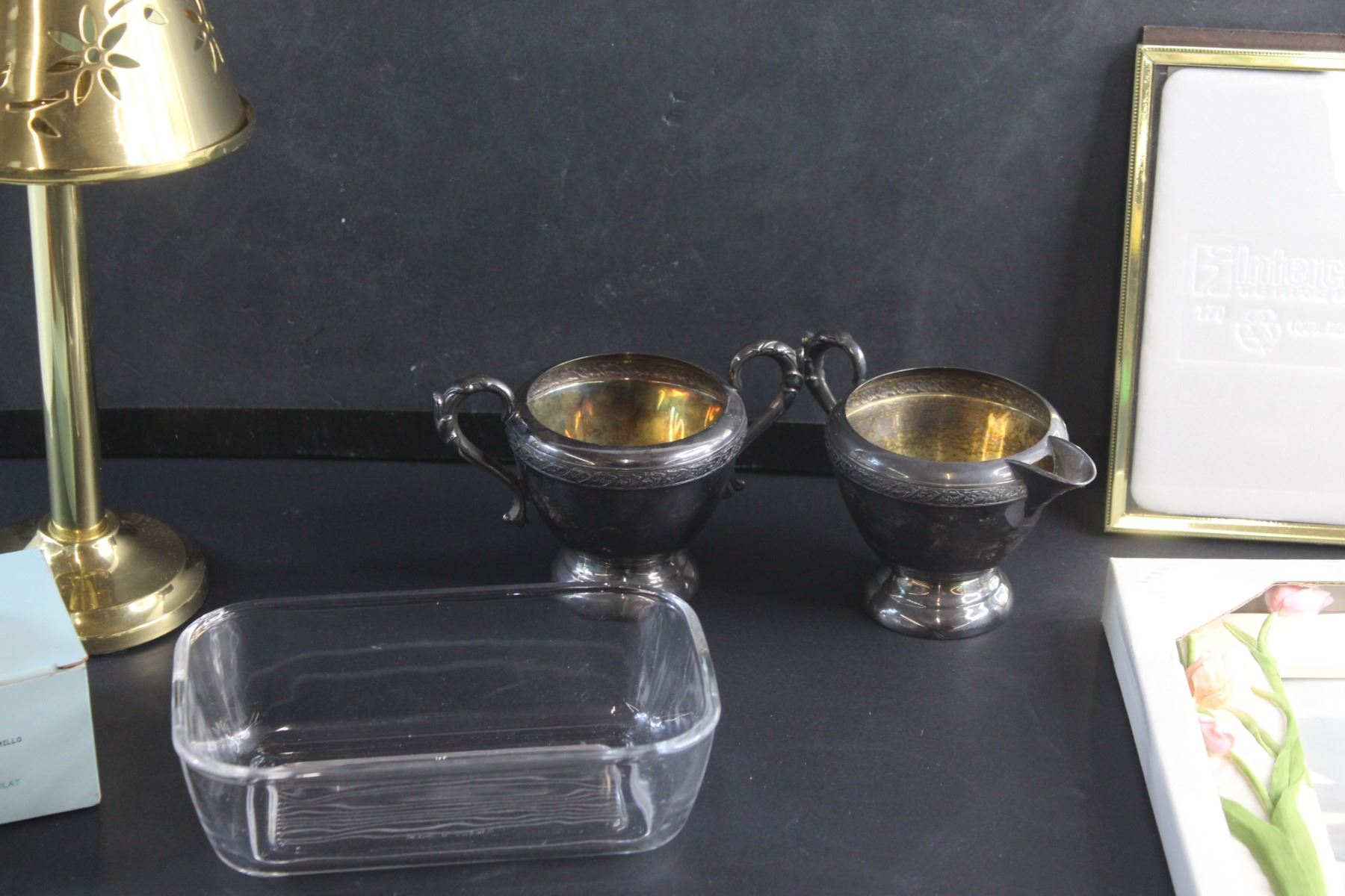 (2) Photo Frames, Brass Candle Holder, Butter Dish, Cream & Sugar Set and Party Lite Scented Candles