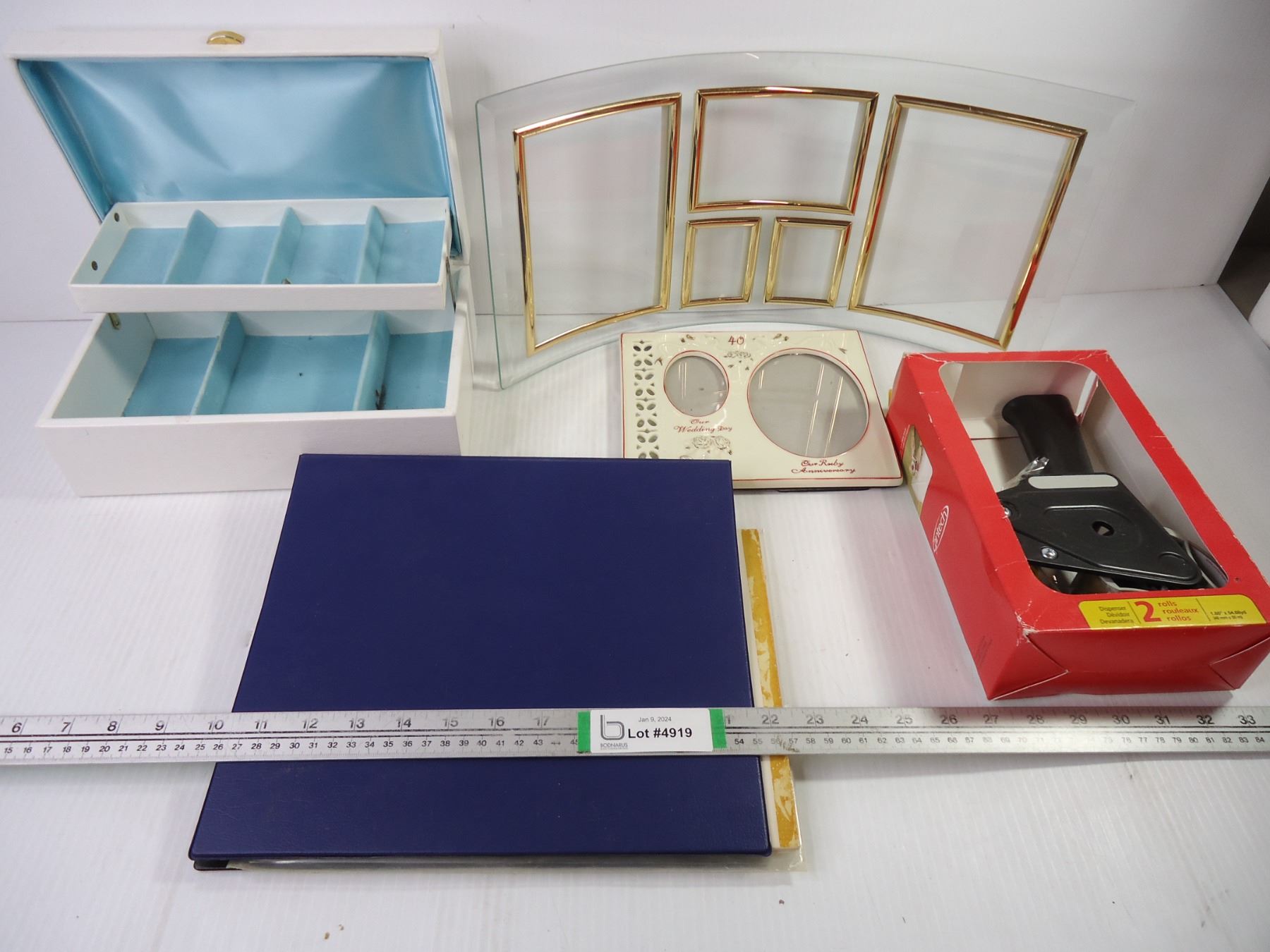 (2) Photograph Holders, Packing Tape Dispenser, Binder with Paper and Jewelry Box