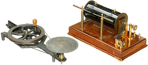 2 physikalische Demonstrations-Instrumente, um 1900 1) Schwungmaschine, Gußeisen, unbezeichnet, früher Antrieb in Physik-Laboratorien, mit aufgesetzter Klangscheibe (Lochsirene nach Seebeck), Länge: 75 cm. - Und: 2) Großer Funkeninduktor nach "Rühmkorff", mit Polwender, Hersteller: "W. & J. George & Becker Ltd. Birmingham & London". - Beide Geräte funktionstüchtig.