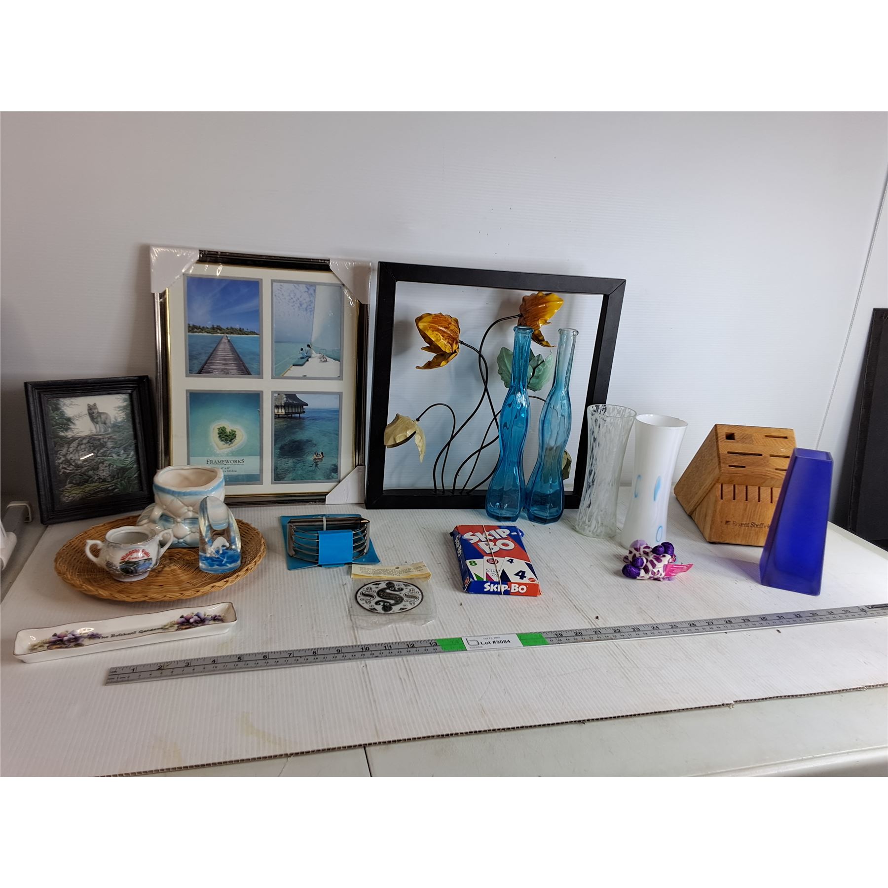 (2) Picture Frames, Wall Decor, Skip-Bo Card Game, Kitchen Knife Block, Decorative Glass Vases, Mis