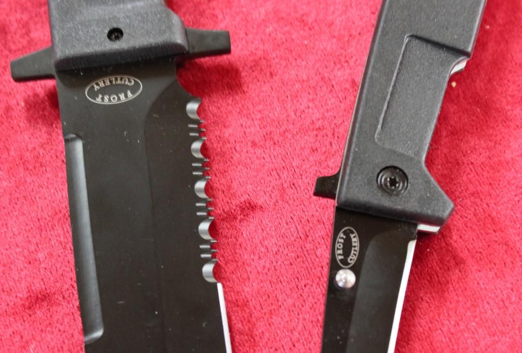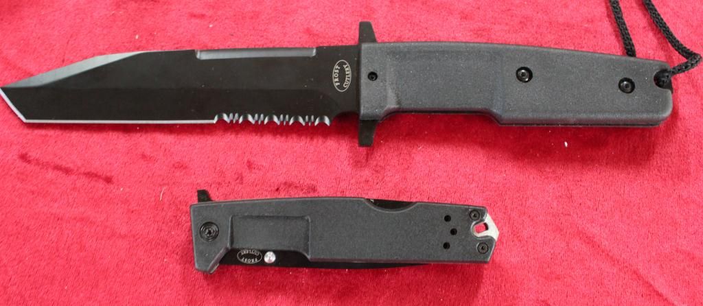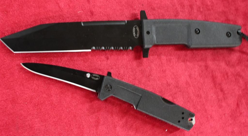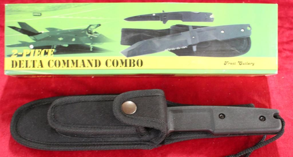 Set Includes: 11" Overall Fixed Blade Tanto & 4.5" Closed Lockback. Stainless Steel Blades, Black Composition Handles, Lanyard Holes, Thumb Stud, Adjustable Tension Setting. Comes With Nylon Sheath That Holds Both