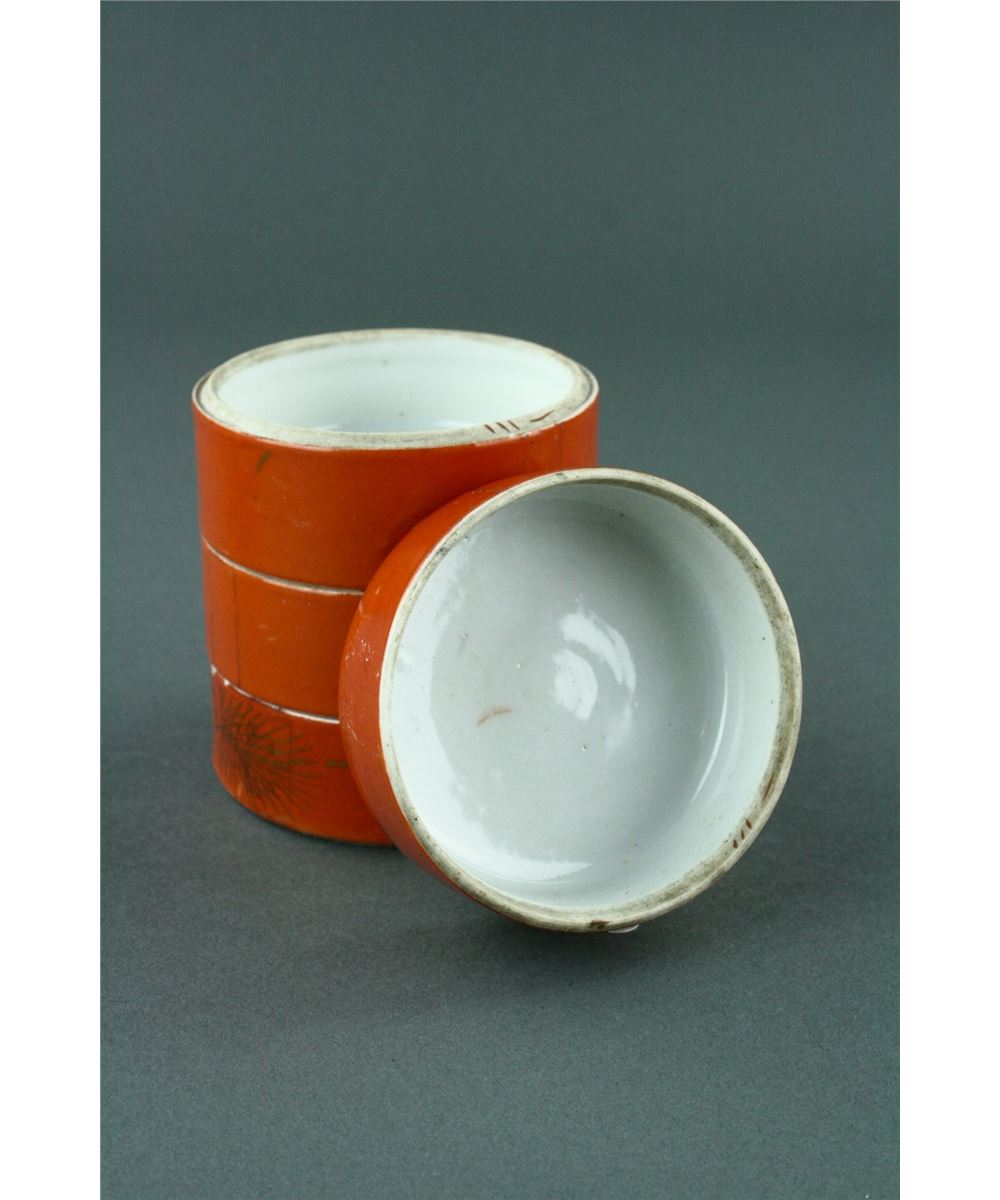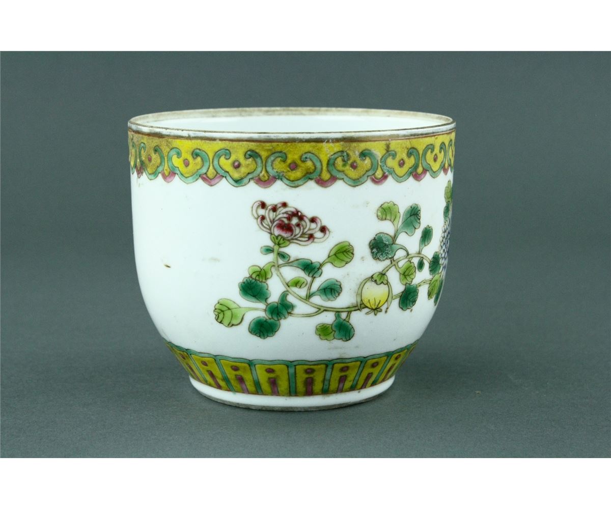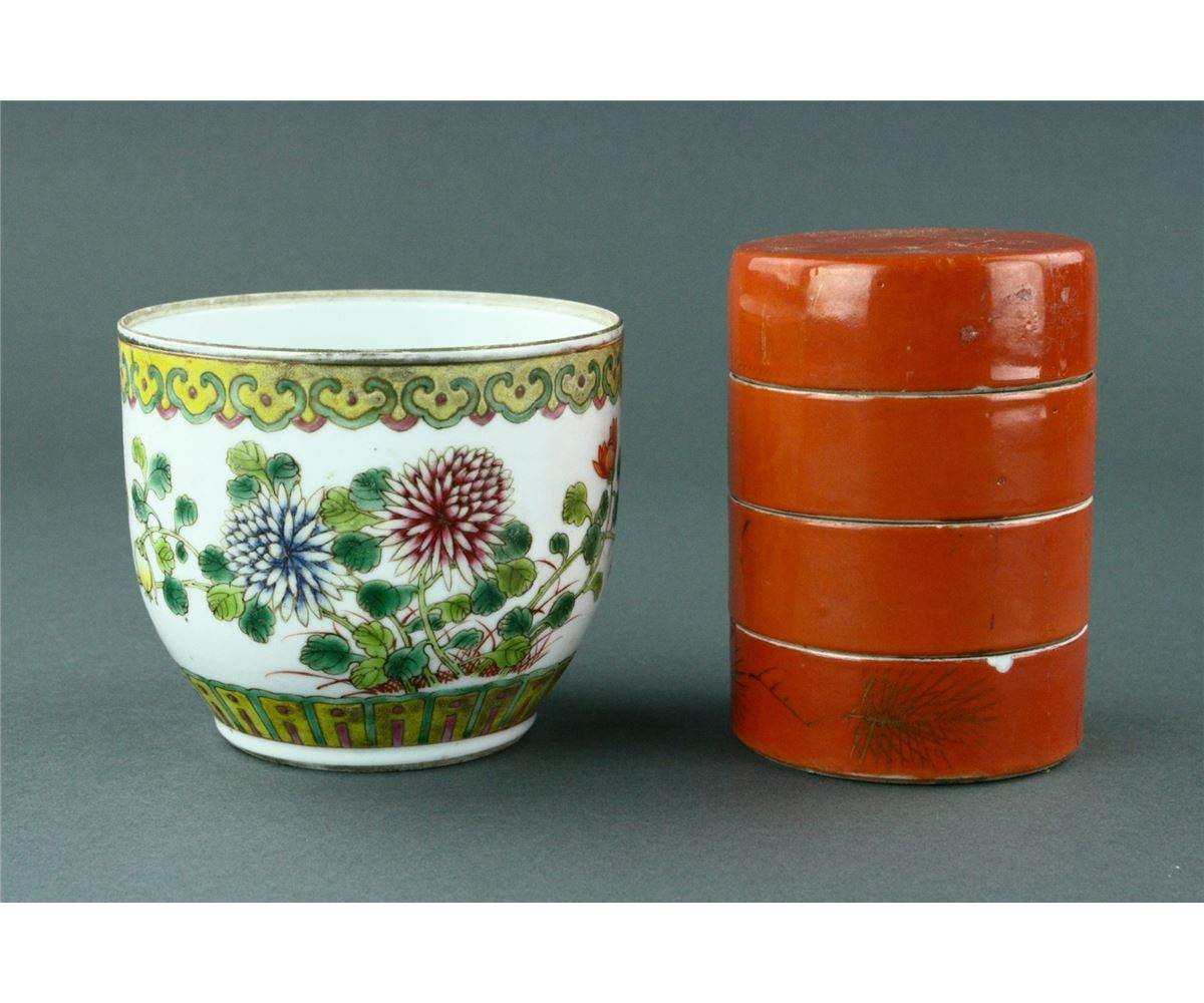 Two pieces of Chinese 19th century porcelain cup and case; featuring flowers and butterfly on cup and gilt bamboo on peach bloom ground on case; H: 10 cm, D: 11 cm, 710 grams (both).