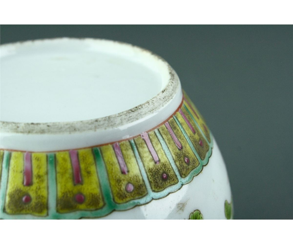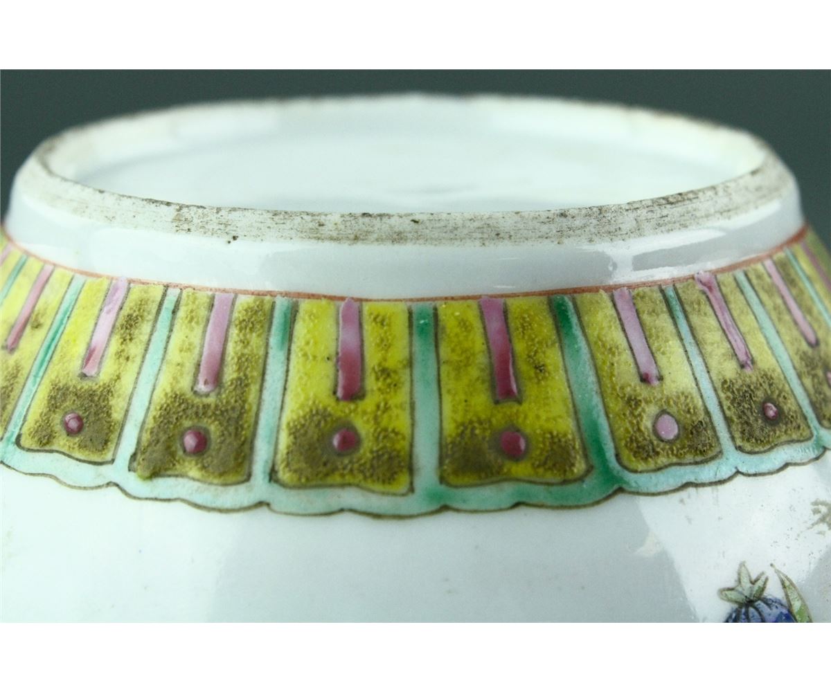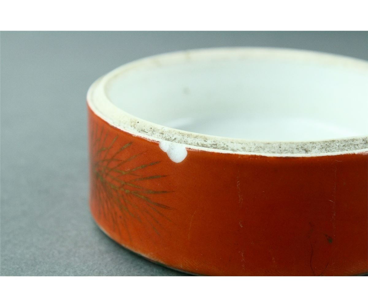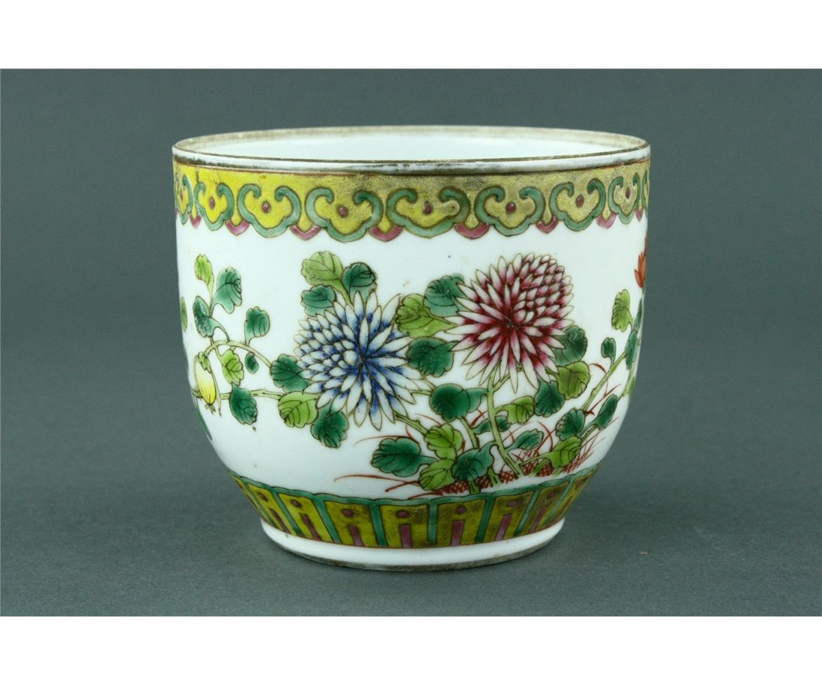Two pieces of Chinese 19th century porcelain cup and case; featuring flowers and butterfly on cup and gilt bamboo on peach bloom ground on case; H: 10 cm, D: 11 cm, 710 grams (both).
