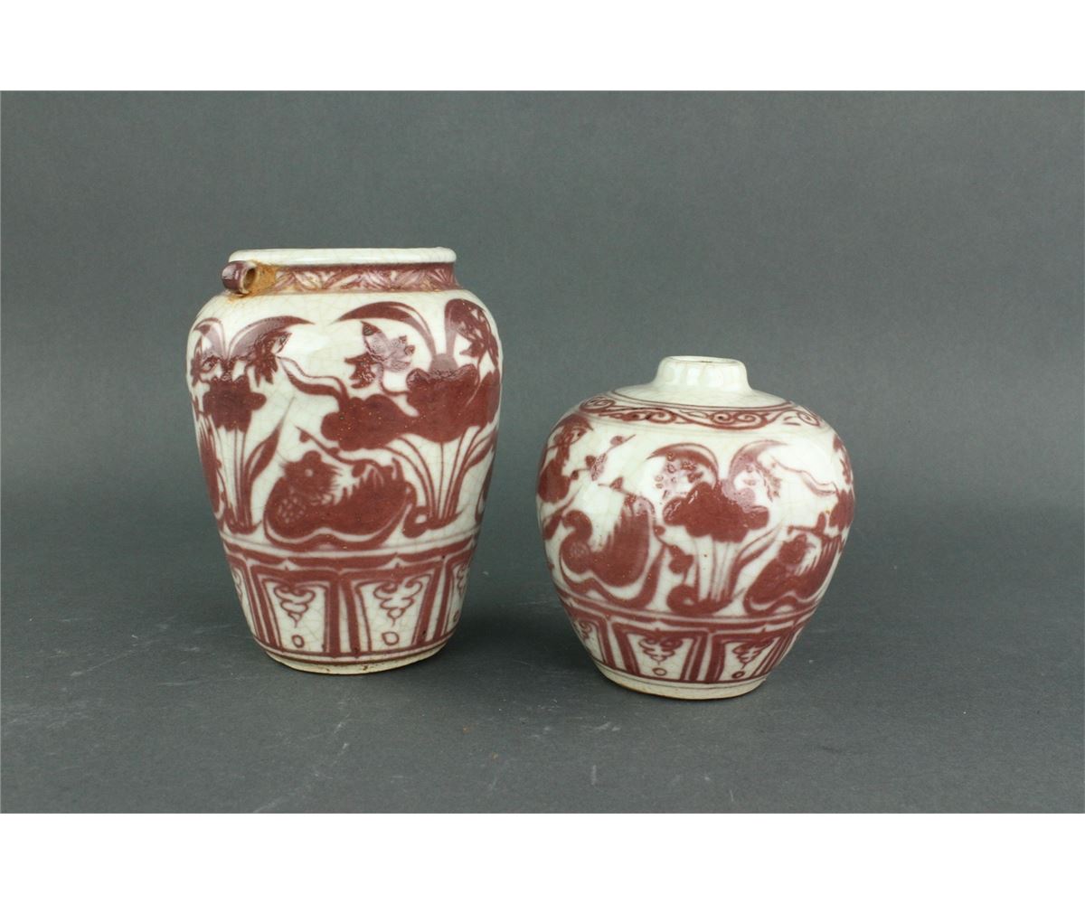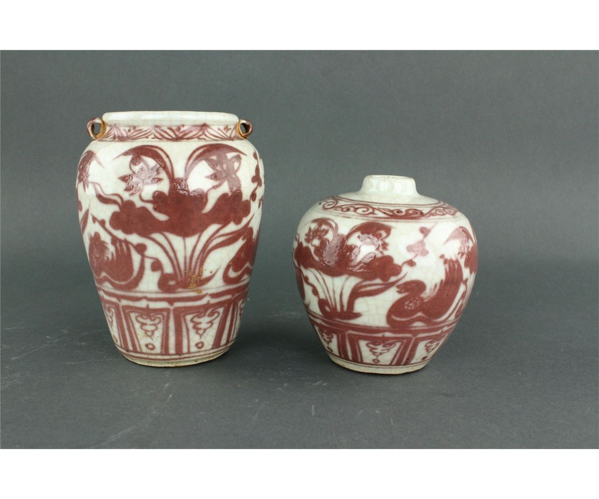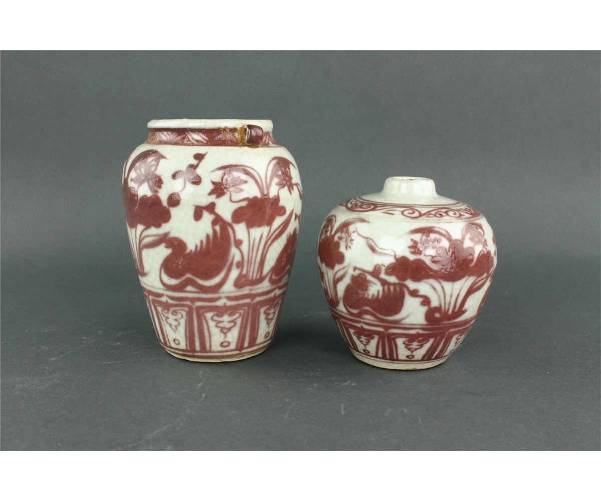 Two pieces of Chinese copper red porcelain ginger jars; featuring two mandarin ducks on lotus pond on body; unglazed base; H: 11 cm, D: 8 cm, 611 grams total