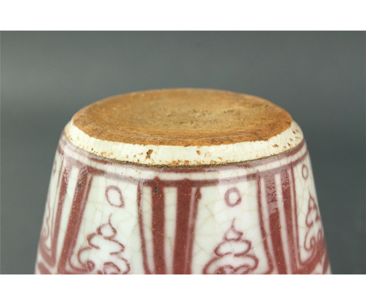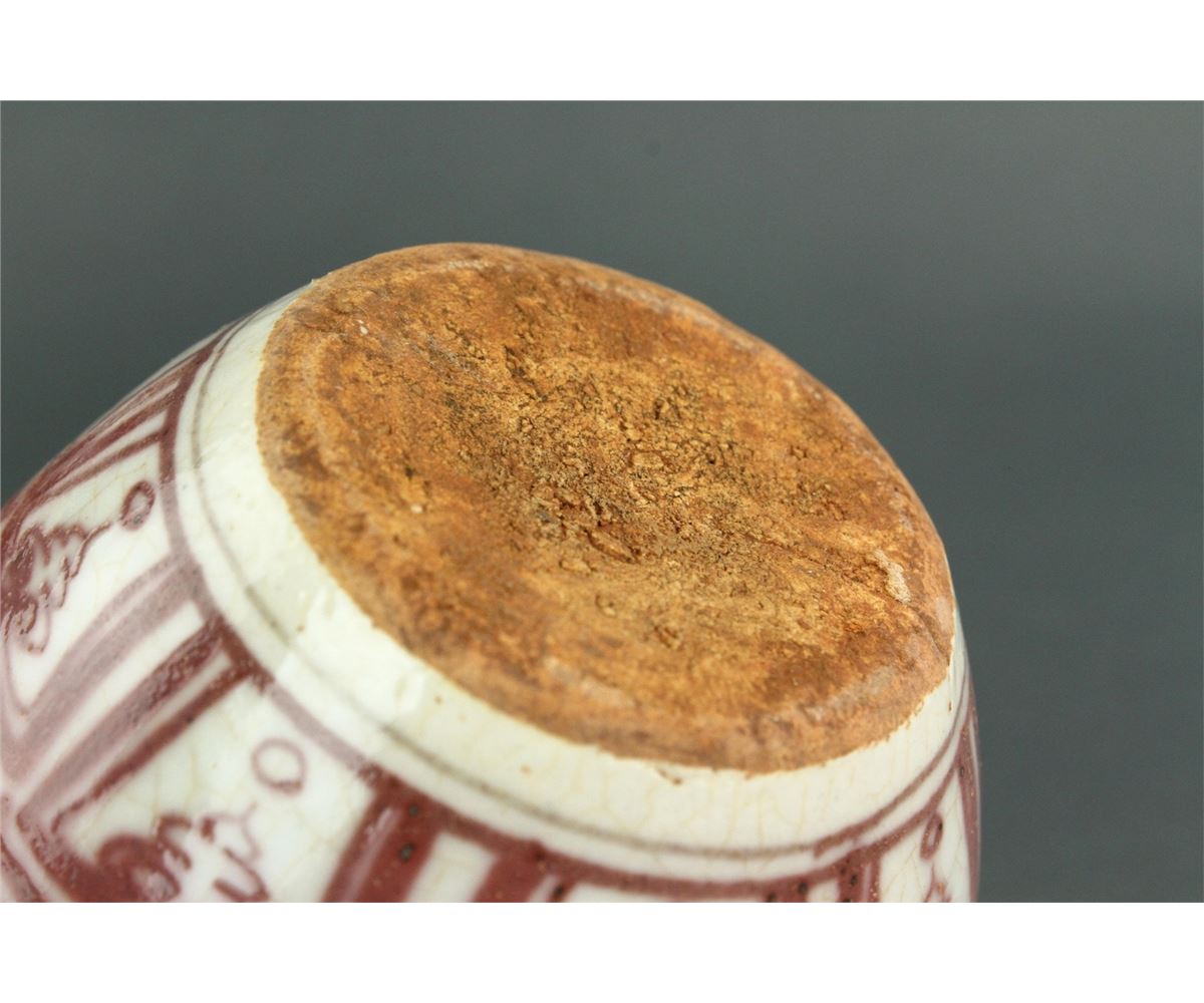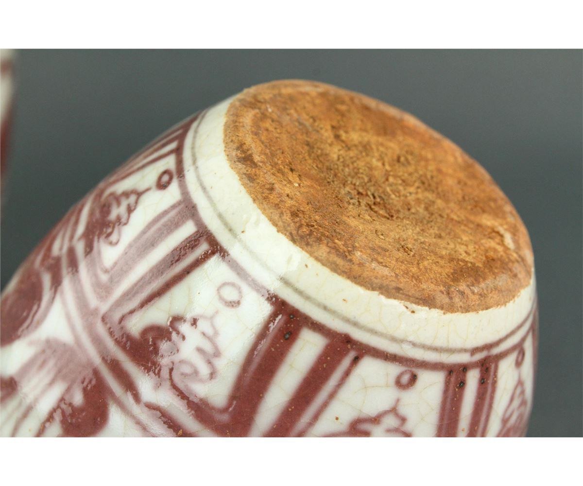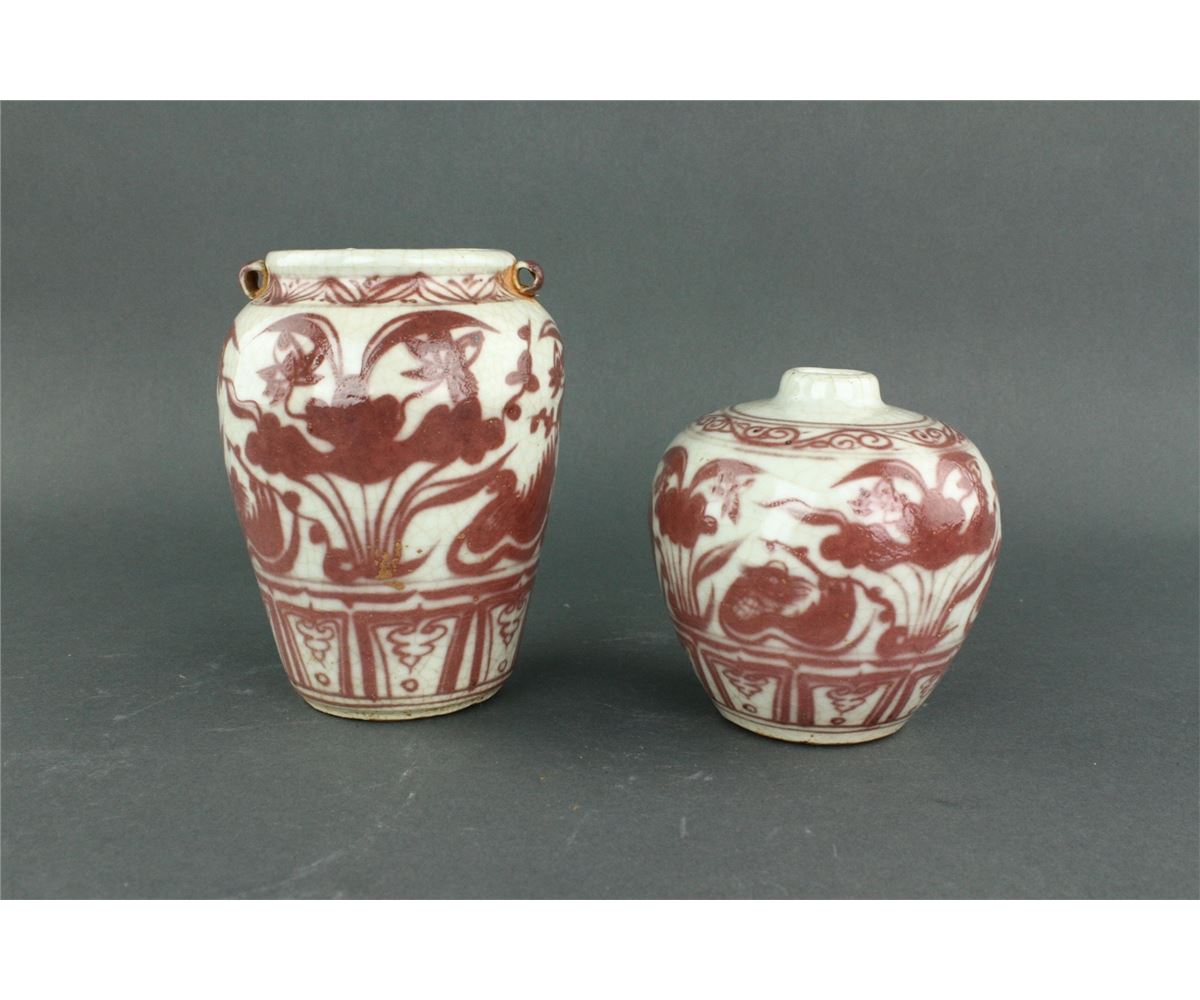 Two pieces of Chinese copper red porcelain ginger jars; featuring two mandarin ducks on lotus pond on body; unglazed base; H: 11 cm, D: 8 cm, 611 grams total