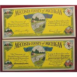2-Pieces Depression Script, Dollar, Mecosta County of Michigan both with obverse printing variations and different Reverses. Choice Uncirculated.