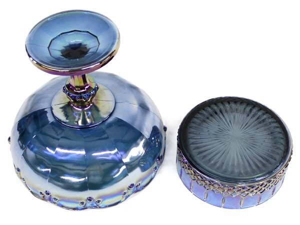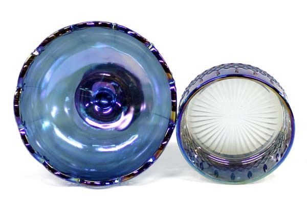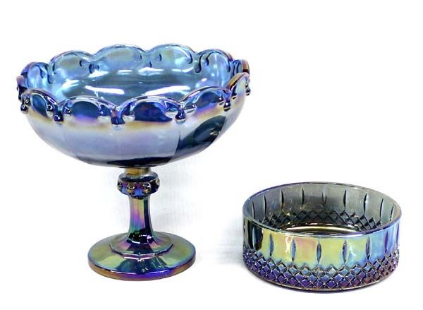 2 Pieces Iridescent Peacock Blue Carnival Glass, includes Pedestal Bowl measuring 7.75'' x 8.5''D and Diamond Cut Bowl measuring 6'' x 2.25''