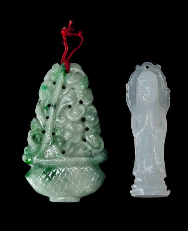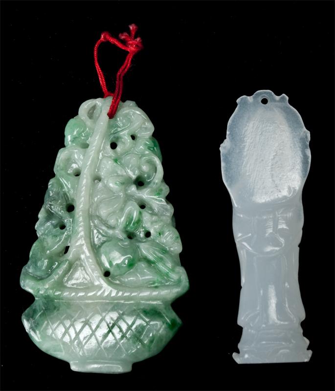 To include a standing Buddha with headpiece in white jade,2.125"H, together with a jadeite plaque finely carved to depict a basket of flowers 2.125"H. the Buddha with small chips to headpiece.