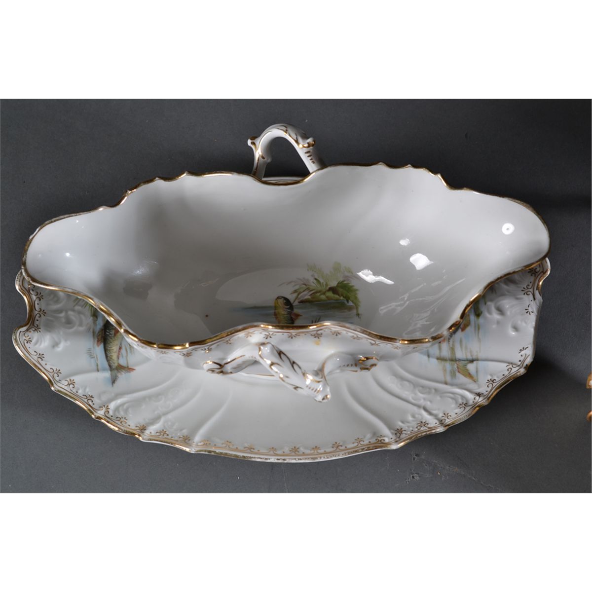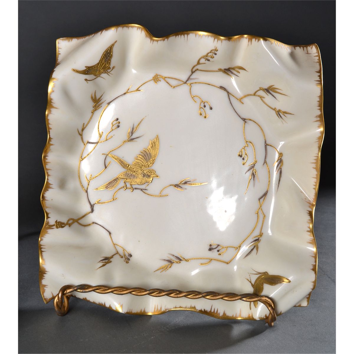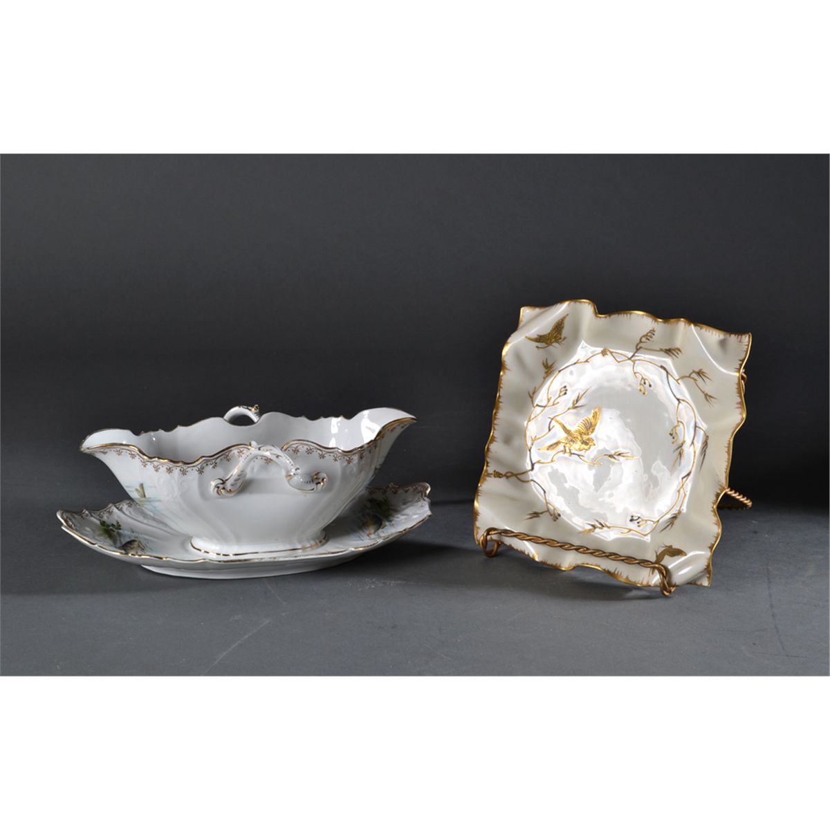 To include a gravy boat and underplate decorated with fish with branch form handles, large chip to underplate. Together with a squared ruffled edge dish decorated in raised gilt to depict birds, butterflies and foliage, marked for Vor Etienne & Fils R. Paradis. 29 Paris, within a pallette, additionally marked J.P. over L. Largest measures 10.5" L, circa early 20th century. Private collection Ada, MI.