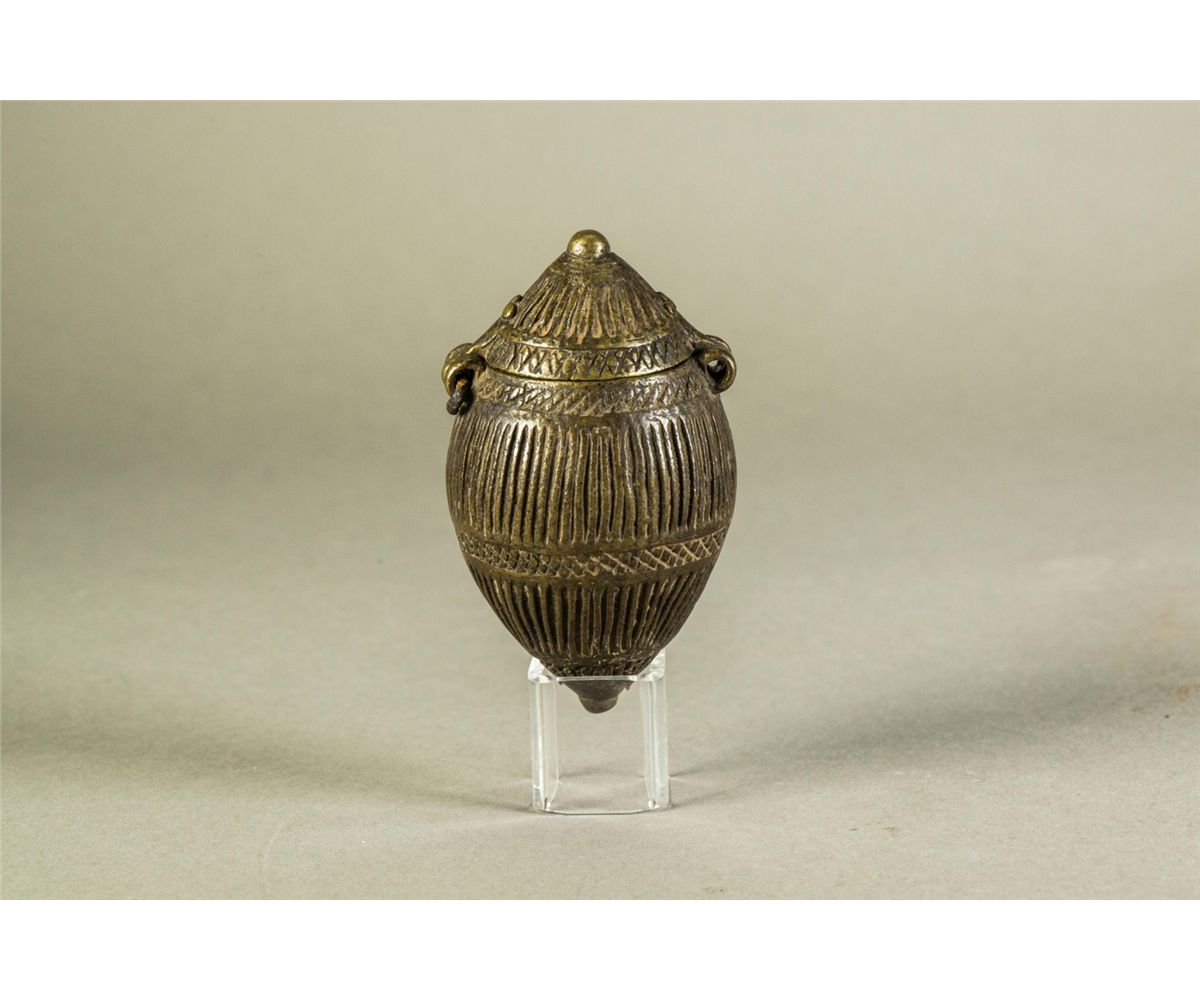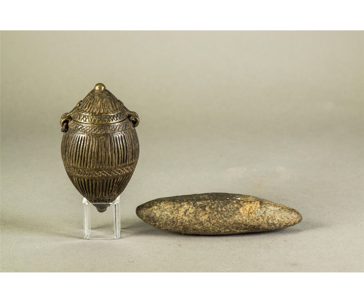 Two pieces of Chinese archaistic metal items; comprised of one pointed bottom case with cover and one natural shape display piece; H: 12 cm, W: 3 cm, 316 gram