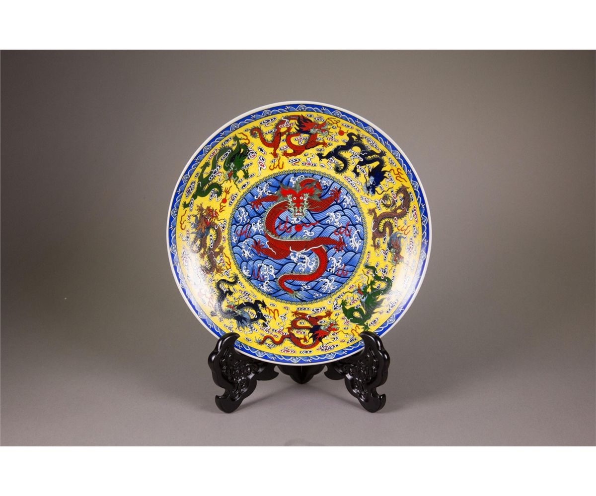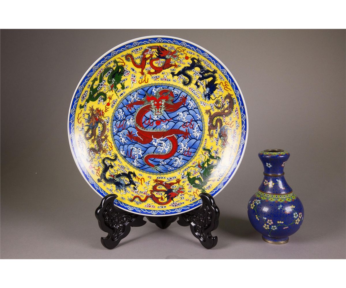 Two pieces of Chinese cloisonne items; featuring one bronze small garlic-mouth vase and one dragon plate; H: 4 cm, D: 25 cm, 825 grams total